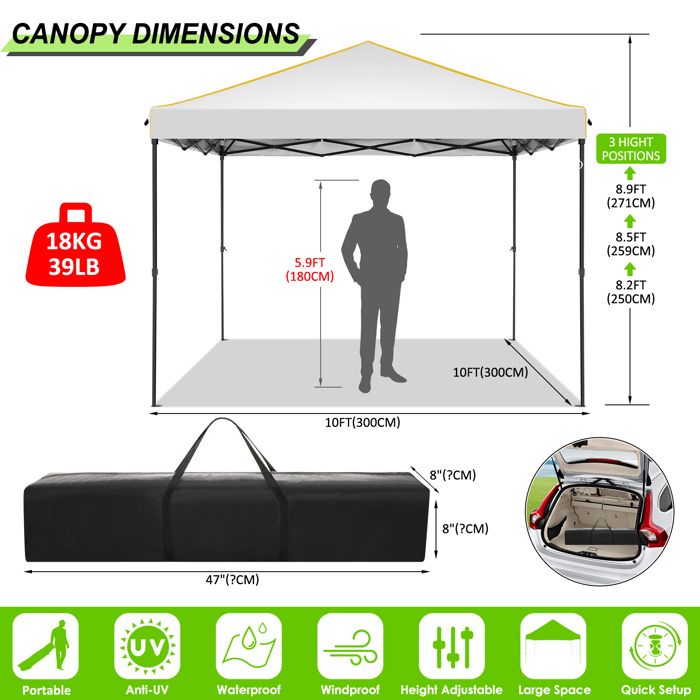 Toit en tissu sélectionné : Conçue pour une protection extérieure optimale, cette tente gazebo est dotée d'un toit en tissu Oxford avec une surface argentée. Étape 2 : Fixez le toit ouvrant avec des attaches bandes. Cadre robuste et coupe-vent : Cet auvent de gazebo d'extérieur est soutenu par des tubes métalliques épaissis et des structures renforcées pour augmenter sa stabilité. Soutenu par des tubes métalliques épaissis et des structures renforcées, ce gazebo d'extérieur augmente sa stabilité avec 4 cordes à vent et 8 piquets de sol qui ancrent solidement les coins, tandis que les patins antidérapants assurent la stabilité sur les surfaces inégales. GOPLUS Tonnelle Pliant 2,1x2,1M, Tente de Reception Pliante avec Hauteur Réglable, Popup Étape 1 : Dépliez facilement le cadre métallique léger. La conception pop-up à une main et les boutons à dégagement rapide facilitent l'installation. Tonnelle de Jardin Pliante - ALIGHTUP - 3.3 x 3.3M - Double toit... Toit ventilé et application polyvalente : Cette tente gazebo escamotable est dotée d'une bouche d'aération supérieure pour réduire la pression du vent et améliorer la circulation de l'air. Cette tente gazebo est dotée d'un toit en tissu Oxford avec une surface recouverte d'argent qui offre une excellente protection solaire. Étape 3 : Réglez la hauteur sur l’un des 3 réglages prédéfinis à l’aide du mécanisme de verrouillage sécurisé. Sac De Transport Portable GOPLUS Tonnelle De Jardin Pliante Avec Hauteurs Réglables, Pavillon Toit Oxford Argenté Protection Solaire GOPLUS Tonnelle Pliante 3x3, Barnum Pliable de Jardin Extérieur avec... Vous pouvez donc emporter cette crème solaire partout avec vous !