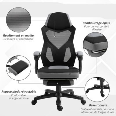 Doux à l’extérieur, ferme à l’intérieur. 🪑 Allonge-toi comme tu veux, quand tu veux: Besoin d’un break ? Le dossier réglable s’incline facilement de 90° à 135°, parfait pour te concentrer, te détendre ou faire une micro-sieste. Chaise Télétravail Gaming TRIUMPHKEY Chaise De Gaming En Tissu Fauteuil Gamer Avec Repose-Pied Chaise Bureau Chaise De Bureau Ergonomique, Fauteuil De Bureau Avec Support Lombaire, Fauteuil À Dossier Haut... Grâce au repose-pieds escamotable, tu peux vraiment t’allonger et profiter d’un moment de repos total entre deux parties. Description du produit Transforme ton espace de jeu ou de travail avec une chaise gaming pensée pour ton confort au quotidien. 🎮 Soulage ton dos pendant les longues sessions: Tu passes des heures devant ton écran ? Cette chaise gamer ergonomique est équipée d’un coussin lombaire massant à vibrations — un vrai plus pour détendre le bas du dos, réduire les tensions et éviter la fatigue musculaire. Aucun stress, juste du confort. Ce fauteuil gamer s’adapte à ton rythme. Avec sa structure en acier renforcé et sa base métallique stable à 5 branches, elle t’offre une solidité rassurante même dans les moments les plus intenses. 🛡️ Stable, solide, fiable — même en pleine action: Avec sa structure en acier renforcé et sa base métallique à 5 branches, ce fauteuil gaming reste parfaitement stable, même quand la partie devient intense. Avertissement De Sûreté Attention : veuillez suivre les instructions pour un montage sûr de la chaise., Poids maximum : 18,5 kg. Fauteuil gamer ergonomique - Rattantree Chaise de bureau - Avec appui-tête, Support lombaire et... En plus, la mousse haute densité à rebond élevé épouse ton corps et soutient parfaitement, même pendant les longues sessions. 🔧 Montage simple & service client aux petits soins: Toutes les pièces sont bien identifiées, le manuel est clair, et le montage se fait en moins de 30 minutes. Facile à monter, agréable à utiliser, cette chaise gaming en tissu est parfaite pour ceux qui veulent allier style, confort et performance — à la maison comme au travail. WOLTU Racing Chaise de Bureau en Tissu - Gaming Chaise - Fauteuil Gamer
