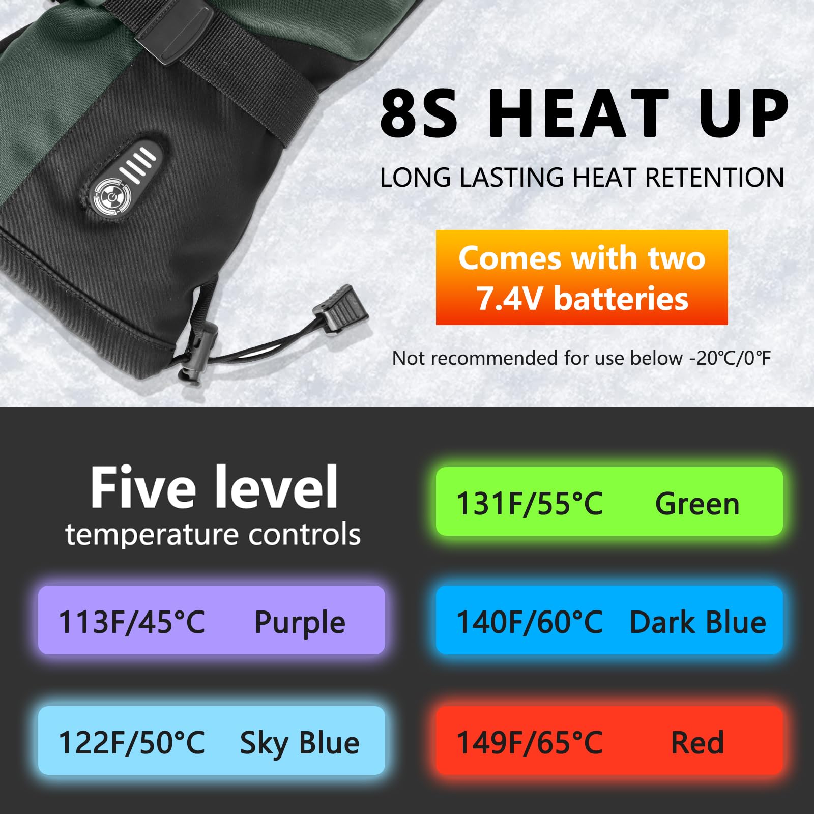 Le design neutre et les différentes tailles conviennent bien. Gants Chauffants écran Tactile Gants Chauffants - QINGQUE - Hiver - 3 Modes De Chauffage - Imperméables - Écran Tactile Gant Chauffant Velo 【Gants chauffants rechargeables】 Les gants chauffants sont alimentés par une paire de batteries de 7,4 V 3000 mAh et réchauffent vos mains en 30 secondes. Ces gants chauffants sont un excellent compagnon pour les activités hivernales comme le ski, la moto ou la randonnée. Dotés de batteries rechargeables de 7,4V 3000mAh, ils offrent une bonne autonomie pour garder les mains au chaud, même par grand froid Vous pouvez choisir la température appropriée en fonction de la scène et de la météo. La doublure intérieure douce conserve la chaleur et protège votre peau. Gants Chauffants - QINGQUE - Hiver - 3 Modes de Chauffage - Imperméables - Écran Tactile... L'autonomie est respectivement de 2-3 heures, 3-4 heures et 6-7 heures. 【Imperméables et antidérapants】 La pochette imperméable en TPU intégrée et la coque extérieure résistante à l'usure gardent vos mains au sec et au chaud sous la pluie et la neige. Ils s'allument automatiquement lorsque vous portez les gants et s'éteignent automatiquement après les avoir retirés. Gants chauffants SURENHAP - Hommes Femmes - Batterie 8000mAh - 3 niveaux de chauffage 【3 niveaux de température】 Basculez facilement entre 3 niveaux de chauffage par simple pression d'un bouton : Élevé (60-65°C, LED rouge allumée), Moyen (50-55°C, LED verte) et Bas (40-45°C, LED bleue). Cela évite le gaspillage d'énergie si vous oubliez de les éteindre.