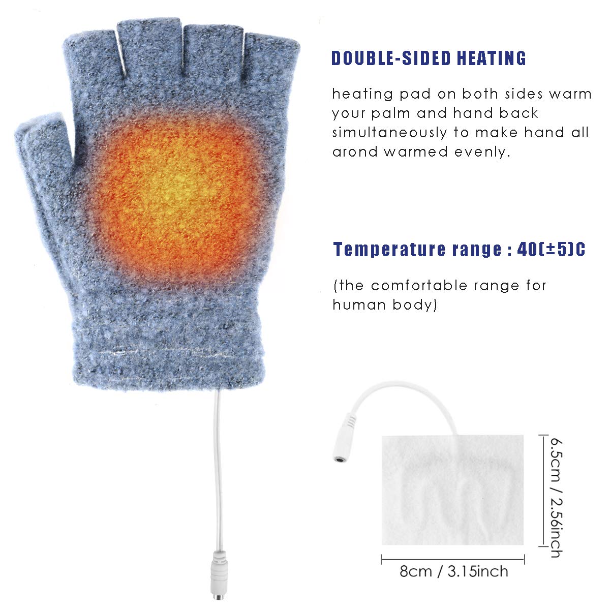 Plage de température: 40 (± 5) ° C Gants chauffants USB pour femmes et hommes, tricot mains pleines et mi-chauffant Le coussin chauffant est à infrarouge lointain (fibre de carbone infrarouge), durable et d'une grande efficacité. Gant Chauffant Usb Rehomy Gants Chauffants USB Pour Homme Et Femme, Gants D Chaufferette Main Rechargeable Chauffage double côté Tapis de chauffage des deux côtés, réchauffez votre paume et remonte à la main simultanément pour rendre les mains tout autour réchauffées uniformément. Gants à moitié et à pied Ces gants avec un couvercle de doigt plié peuvent être utilisés comme gants à moitié doigts et gants à doigt. Ces gants avec un couvercle de doigt plié peuvent être utilisés comme gants à moitié doigts et gants à doigt. C'est une demi-doigt conçu parfait pour le jeu, en tapant, utiliser la souris 【 Nombreuses utilisations】utilisé dans de nombreuses occasions en hiver ou en automne froid, adapté pour jouer, taper, utiliser la souris, et plus d'autres situations telles que le travail, le jeu, le ski, l'équitation, la randonnée, l'exploration en plein air, etc. Son design tendance vous apporte plus que chaleur, mais tendance. Un accessoire indispensable en hiver ou en automne froid, adapté pour le ski, le snowboard, la pêche sur glace, le vélo, la moto, la randonnée, le camping, l'exploration en plein air et plus encore Gants chauffants USB - 4 couleurs pour votre choix Tissu élastique pour un excellent ajustement Ultra-doux et élastique, convient parfaitement à ce que vous propose une excellente flexibilité pour vous assurer que vos mains et vos doigts sont libres de bouger. 【Chauffage Confortable et Double Face 】température de chauffage à environ 40 (± 5 °C), ce qui est la gamme la plus confortable pour le corps humain, vous ne vous sentirez pas au sec par la température avec nos coussinets chauffants des deux côtés, réchauffez votre paume et votre main en même temps pour conduire plus rapidement la température, et réchauffez la main uniformément. Ne frottez pas trop les gants lorsque vous nettoyez pour éviter d'endommager les pièces chauffantes; 2., Pls débranchez le câble d'alimentation en temps utile lorsqu'il n'est pas utilisé. 【Gants demi-doigts avec protège-doigts】 Son demi-doigt est conçu pour taper ou jouer, mais avec le protège-doigt plié dans le dos, relâchez le bouton pour déplier le protège-doigt pour garder les doigts au chaud lorsque vous ne tapez pas.