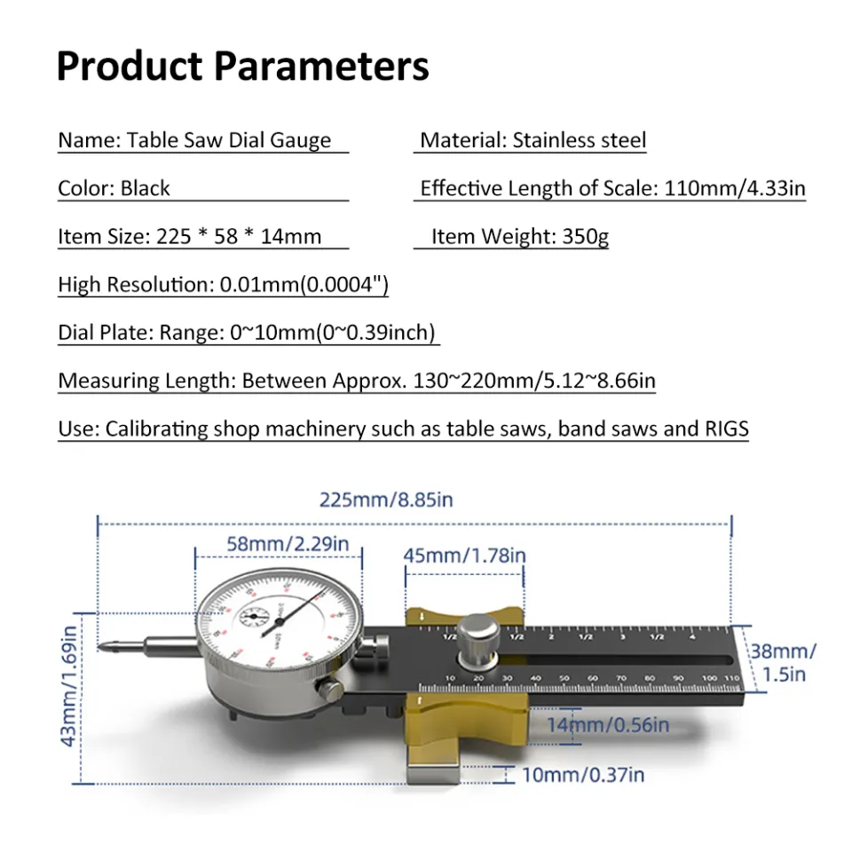ADJUSTABLE LENGTH: The table saw calibrator adopts a unique sliding head design, which can adjust the measurement length, lock tightly, will not swing from side to side, the measurement length is between 130-220mm sturdy MATERIAL: Constructed with high wear hard probe and excellent stainless steel measuring rod, this table saw gauge is built to withstand heavy use and impact, ensuring long-lasting performance. COMPLETE PACKAGE: Comes with a hex wrench and grub screw for easy installation and adjustment, making it a must-have tool for any woodworking enthusiast or professional. Jauge Acier Inox Durable Table Saw Gauge, Adjustable Band Saw Calibration Tool Dail Jauge Affichage Choc Lisible ACCURATE MEASUREMENT: Features a sensitive and clear dial gauge with a large display pointer scale for easy reading, providing fast and convenient measurement with accurate values. With an adjustable measuring length of about 130mm to 220mm, this tool is ideal for calibrating various machines like table saws and band saws. Its shockproof dial with a large screen provides clear and direct readings for easy measurement Item Type: Table Saw GaugeMaterial: Stainless steelColor: BlackUse: Calibrating shop machinery such as table saws, band saws and RIGSMeasuring Length: Between Approx., 130 ~ 220mm / 5., 12 ~ 8., 66inPackage List:1 x Table Saw Gauge1 x Hex Wrench1 x Grub Screw Neoteck 0-1/0.001 Dial Indicator Table Saw Gauge Suitable for Table Saws with a Groove Width of 3/4 (19mm) or More for Aligning and Calibrating in Workshop,Machinery,Band Saw and Drill Press-Black