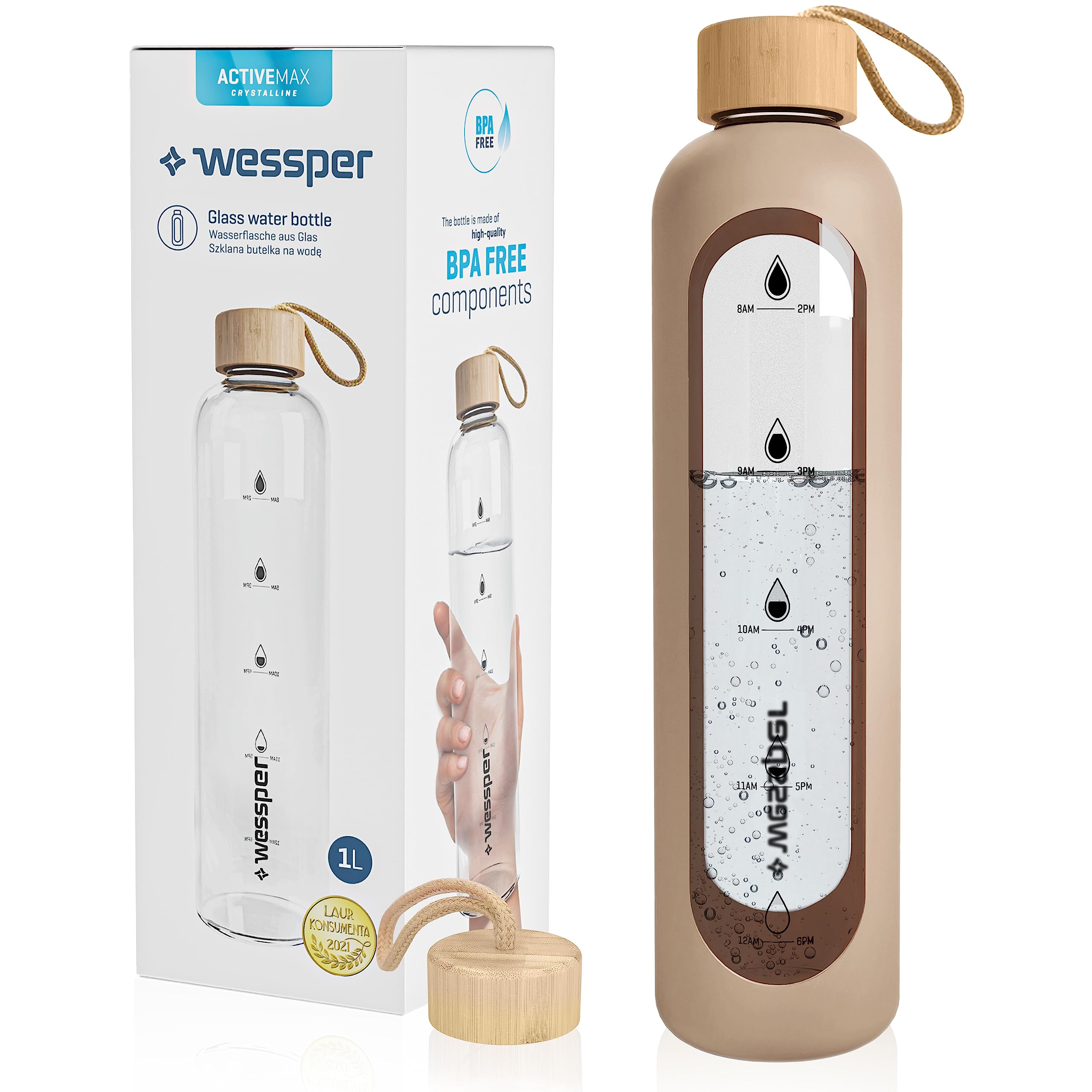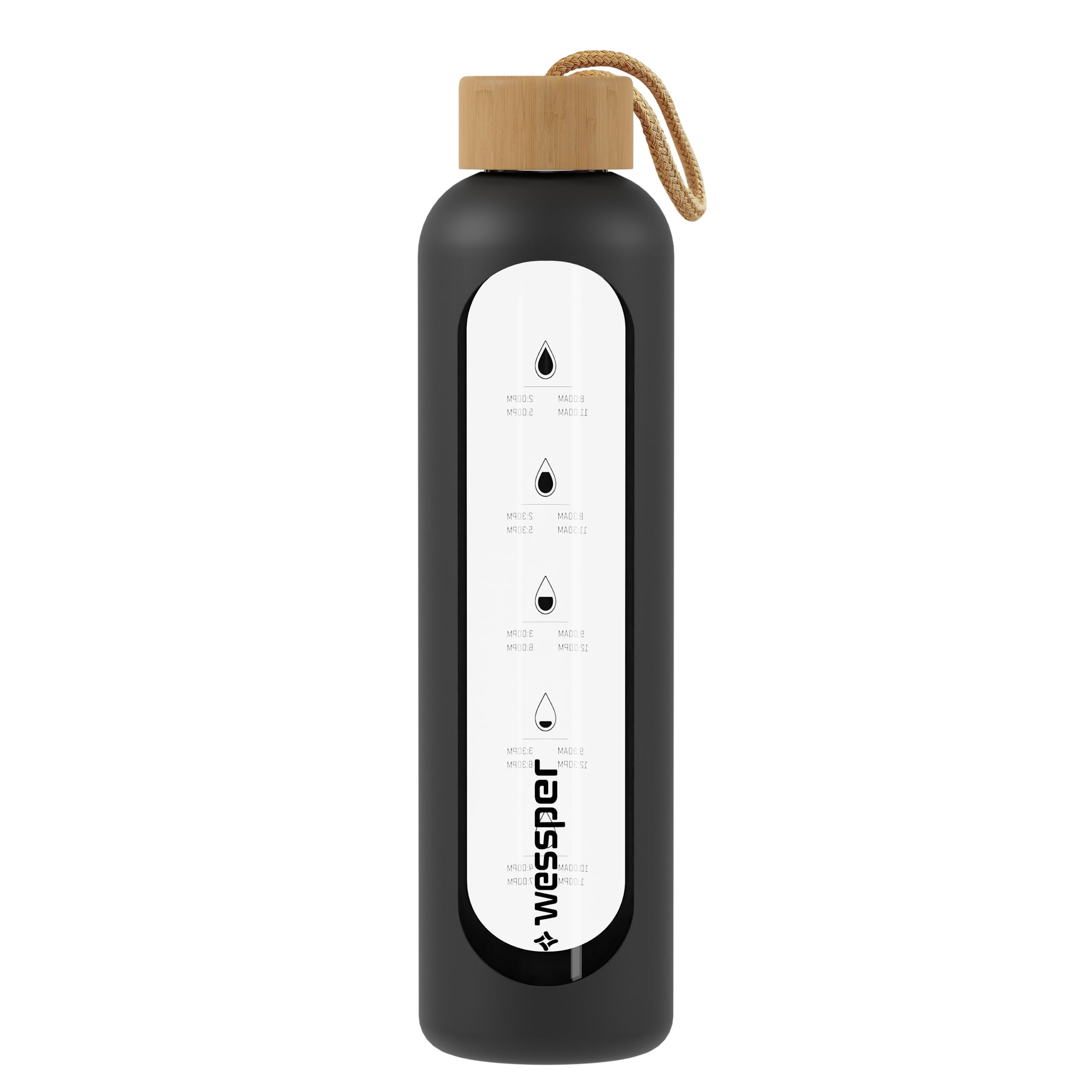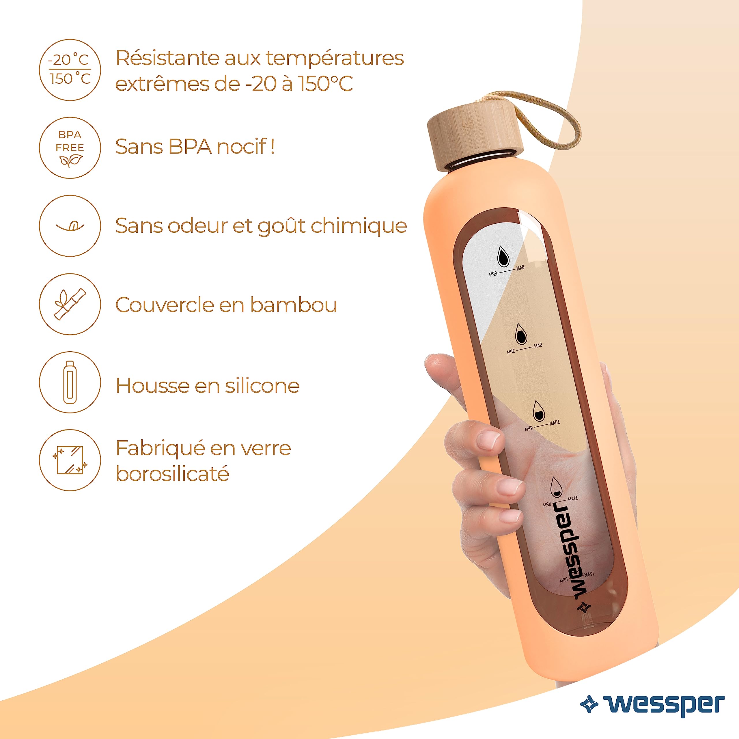Wessper Bouteille d’eau 1L de Motivation en verre avec temps horaire, Sans BPA, Gourde en verre hermétique 1000 ml avec couvercle en bambou Bouteille D'eau 1L Avec Marqueur Temps Gourde En Verres 1 Litre Avec Paille Et Marqueur De Temps, 1 Litre, Gourde De Gourde Avec Marqueur Temps Description du produit Alternative saine et cologique Gourde en verre borosilicate sans BPA, n absorbe ni odeurs ni saveurs et remplace les bouteilles jetables. R sistance thermique de 20 C 150 C Verre tremp de qualit laboratoire ; housse en silicone antid rapante prot ge vos mains et la bouteille. Graduation horaire motivante Rep res discrets toutes les heures pour vous rappeler de boire r... Résistance thermique de –20 °C à 150 °C – Verre trempé de qualité laboratoire ; housse en silicone antidérapante protège vos mains et la bouteille. Wessper Gourde en verre de 1 l avec marqueurs de temps, sans BPA, motivation à boire, bouteille d'eau en verre borosilicate, hermétique avec couvercle en bambou... Large ouverture Ø 5 cm – Ajoutez facilement glaçons, fruits ou herbes ; nettoyage simple à la main ou au lave-vaisselle (sans bouchon). Graduation horaire motivante – Repères discrets toutes les heures pour vous rappeler de boire régulièrement et atteindre votre objectif d’hydratation quotidien.