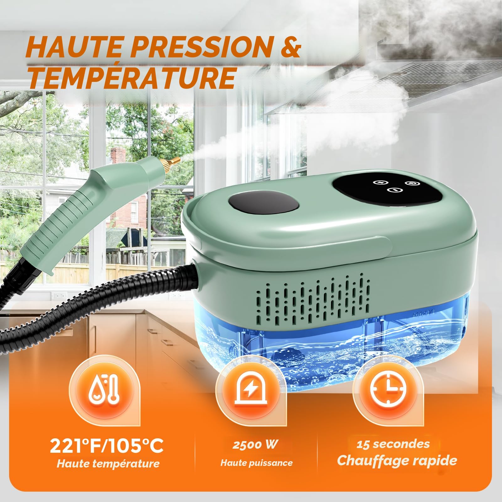 La fonction vapeur intégrée sur la poignée avec niveaux réglables ainsi que la commande tactile à 9 niveaux permettent un ajustement précis de la puissance de vapeur et de l'humidité. Nettoyeur Vapeur 2500W, Nettoyeur Vapeur À Main, 1000Ml Réservoir D'Eau Le nettoyeur vapeur est équipé d'un tuyau d'évacuation de vapeur de 2 mètres de long et d'un câble d'alimentation de 1,5 m de long, ce qui assure une manipulation confortable et une flexibilité. Longueur du tuyau vapeur : 2 m. Le nettoyeur vapeur manuel est particulièrement bien adapté pour les carreaux et les joints et est donc un nettoyeur vapeur fiable pour une utilisation polyvalente dans la salle de bain. Pression : 3 bar Température de la vapeur : environ 105 °C maximum. Les dimensions compactes de 20,5 × 14,5 × 15 cm du nettoyeur vapeur permettent une optimisation facile de l'espace de rangement. Nettoyeur vapeur 2500 W pour canapé, sans réservoir d'eau, tuyau d... Description du produit : Avec une puissance de 2500 W et une pression de 3 bar, notre nettoyeur vapeur atteint une température de 105 °C en seulement 10 secondes. Réservoir d'eau : 1200 ml Puissance : 2500 W., Tension : 220 V. Le boîtier résiste à des températures élevées, assure sécurité et durabilité. Avec sa méthode de nettoyage sans produits chimiques, il élimine efficacement la saleté et garantit un nettoyage en profondeur et respectueux de l'environnement. Pour éviter le surremplissage, le niveau d'eau est maintenu à cette capacité ou en dessous. Nettoyeur Vapeur Portable Réglable Nettoyeur Vapeur Portatif 2500 W, Grand Réservoir D'eau De 1100 Ml Nettoyant Vapeur 9 températures réglables. 1 grande brosse en nylon. Caractéristiques du produit : Matériau : ABS. Grâce à sa construction intelligente, le nettoyeur à vapeur est extrêmement flexible et convient pour différentes tâches de nettoyage. Accessoires polyvalents pour toutes les applications : le kit complet d'accessoires avec brosses en nylon et laiton, tige d'extension et brosse en verre élargit la fonctionnalité du nettoyeur vapeur. Il élimine efficacement la saleté, l'usure, la poussière et les taches de toutes les surfaces et rend vos activités de nettoyage quotidiennes sans effort et sans produits chimiques. Notre nettoyeur vapeur polyvalent est livré avec un kit complet de 9 accessoires. Matériaux robustes et construction fiable : notre nettoyeur vapeur manuel est fabriqué en plastique ABS de qualité supérieure, ce qui le rend idéal pour un usage quotidien. Nettoyeur vapeur puissant avec contrôle intelligent : avec une puissance de 2500 W et une pression de vapeur de 3 bar à 105 °C, le nettoyeur vapeur chauffe en seulement 15 secondes. Avec ces outils polyvalents, vous pouvez facilement nettoyer les cuisinières, les ustensiles de cuisine, les carreaux, les joints, les canapés, les tapis et l'intérieur de la voiture - Une solution tout-en-un pour tous vos besoins de nettoyage ménager., Contenu de l'emballage : 1 petite brosse en nylon. Nettoyeur vapeur haute température et haute pression 2500 W Nettoyeur... Idéal pour éliminer efficacement la saleté et les taches sur toutes les surfaces.