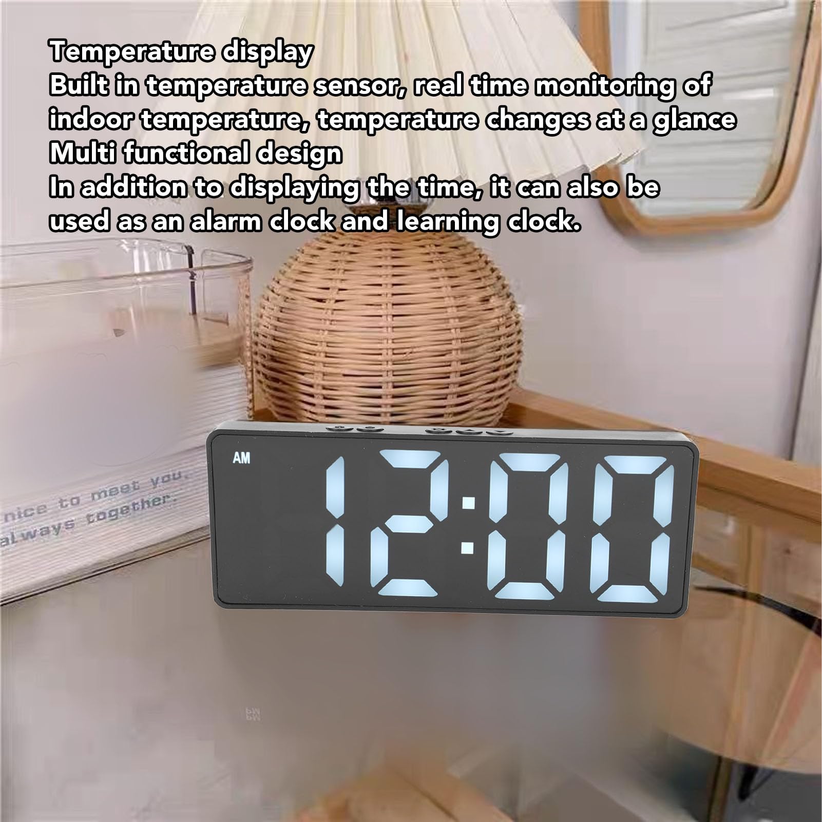 [Compagnon d'Éducation Précoce] Intégrant une fonction d'éducation précoce, ce réveil favorise de saines habitudes d'étude et stimule l'intérêt pour l'apprentissage dès le plus jeune âge. [Gestionnaire de temps multifonction] Ce réveil numérique combine plusieurs fonctions essentielles, y compris alarme, minuterie et rappel, dans un seul appareil élégant. Son design intuitif et ses rappels constants renforcent le sens des responsabilités et l'indépendance, en faisant un outil essentiel pour la réussite académique et l'épanouissement personnel. Avec des rappels vocaux clairs et personnalisables, il assure des rappels ponctuels pour les tâches, améliorant ainsi la productivité et les compétences en gestion du temps. Horloge météo - Station météo numérique pour maison, écran à commande vocale, thermomètre Il inclut des fonctionnalités comme des quiz interactifs et des messages de motivation, en faisant un outil éducatif plus efficace pour aider les enfants à développer un amour pour l'apprentissage. [Intelligent Voice Reminder] Le réveil intelligent est équipé d'un système de rappel vocal avancé par IA qui aide les étudiants à organiser efficacement leurs emplois du temps d'étude. Réveil Électronique Horloge Chambre Réveil Numérique Led Réveil À Commande Vocale Pour Enfants... Sa conception économe en énergie offre une autonomie prolongée, ce qui le rend pratique pour un usage quotidien. Spec : Type d'article : Réveil intelligent Matière : ABS Poids : Environ 324,00 g/11,43 oz Taille du produit : Environ 10,7x11 cm/4,2x4,3 po Type de batterie : Batterie Li (expédiée avec batterie intégrée) Capacité de la batterie : 1500 mAh Liste du colis : 1 x Réveil 1 x Câble de données USB Remarque : (1) Si le nom WiFi ne peut pas être trouvé, veuillez vérifier si le routeur a masqué le WiFi. [Favorise l'autodiscipline] En encourageant de bonnes pratiques de gestion du temps, le réveil avec rappel vocal aide les étudiants à développer de solides habitudes d'autodiscipline. Réveil Educatif Great-Réveil LED Horloge Numérique 3 Groupe De Réveil Commande Vocale Affichage De La Horloge Numérique Rappel Vocal Fonctionnalité de synchronisation avancée] Ce réveil numérique va au-delà du chronomètre de base avec des fonctionnalités comme un calendrier perpétuel et des transitions de format de 12 heures. Réglez les alarmes avec facilité et profitez du suivi du temps précis ajustements fréquents [Long-lasting Battery Life] Équipé batterie intégrée de 1500 mAh et charge USB, ce réveil intelligent garantit une utilisation interruption.