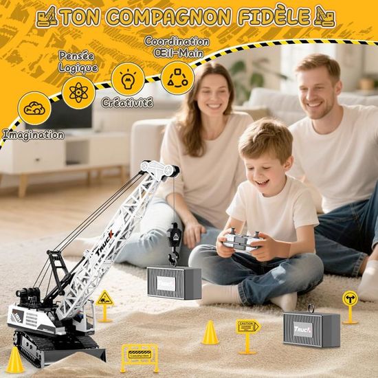 Les phares LED clignotants et les sons de moteur réalistes recréent l'atmosphère réelle du chantier – de jour comme de nuit, les enfants plongent dans un monde de lumière et de sons. Description du produit Cette Cheffery grue sur chenilles télécommandée à l'échelle 1:16 transforme les enfants en véritables petits ingénieurs! Les enfants peuvent voir clairement la structure et les détails de la machine, que ce soit dans le salon ou sur la plage, c'est comme piloter une vraie machine de chantier. 🏗【Corps en ABS Robuste + Crochet en Alliage Durable】Cette grue est fabriquée en ABS de haute qualité, résistante aux chocs et durable, idéale pour une utilisation répétée. Les chenilles en caoutchouc s'adaptent aux sols variés (pelouse, sable, carrelage), pour jouer aussi bien à l'intérieur qu'à l'extérieur. Portée de la Télécommande: Env., 50 m La structure en plastique ABS solide et le crochet en alliage métallique garantissent robustesse et durabilité. Grâce à ses 13 canaux fonctionnels, elle permet d'avancer/reculer, tourner à gauche/droite, monter/descendre le crochet, faire pivoter la cabine sur 680° et lancer une démonstration automatique. Utilisation sous la surveillance d'un adulte recommandée Deux batteries rechargeables de 1200mAh assurent une autonomie prolongée. Cheffery 1:16 Grue télécoandée, 13 Canaux Jouet Grue Télécoandée... Les enfants ressentent le poids et la force réels lors du levage, augmentant le plaisir de jeu et le sentiment d'accomplissement. 🔋【Chenilles Tout-Terrain + Effets Lumineux et Sonores Immersifs】Les chenilles en caoutchouc avec amortissement permettent une conduite stable sur l'herbe, la boue, le sable ou le carrelage. 📦 Contenu de l'Emballage Grue Télécommandée ×1 Retirer les batteries en cas de non-utilisation prolongée À utiliser sous la surveillance d’un adulte JISHUBO Camion de simulation grue RC camion grue télécommandée 1/24 sans fil véhicule de L'emballage soigné en fait un cadeau parfait pour les enfants de 6 ans et plus – ce n'est pas seulement un jouet, mais une expérience de chantier immersive complète. 6 canaux - Pelleteuse électrique télécommandée en alliage, voiture... La fonction de brouillard unique rend le chantier comme couvert de poussière, offrant une immersion bien supérieure à celle des jouets ordinaires. Chenilles Tout-terrain Télécommande Grue Télécommandée Enfant Gruejouet 1:24 Avec Lumières Et Sons Réalistes - Jeux - Jouets Tractopelle Enfant Le crochet en alliage métallique a une plus grande capacité de levage et peut facilement soulever des conteneurs ou de petits objets. ⛳【Échelle 1:16, Présence Réaliste】Cette grue est à l'échelle 1:16, plus grande et plus impressionnante que les jouets de petite taille habituels. 🚧【Devenez un Petit Ingénieur avec Une Grue Géante à 13 Canaux】Votre enfant s'assoit sur son propre poste de contrôle de chantier: avancer, reculer, tourner à gauche et à droite, lever et descendre le crochet, rotation de la cabine à 680° et même démonstration automatique en un seul bouton. ⚙️Caractéristiques du Produit Échelle: 1:16 Le kit comprend un conteneur, 6 petits panneaux de signalisation, un tournevis, une pipette et le manuel.