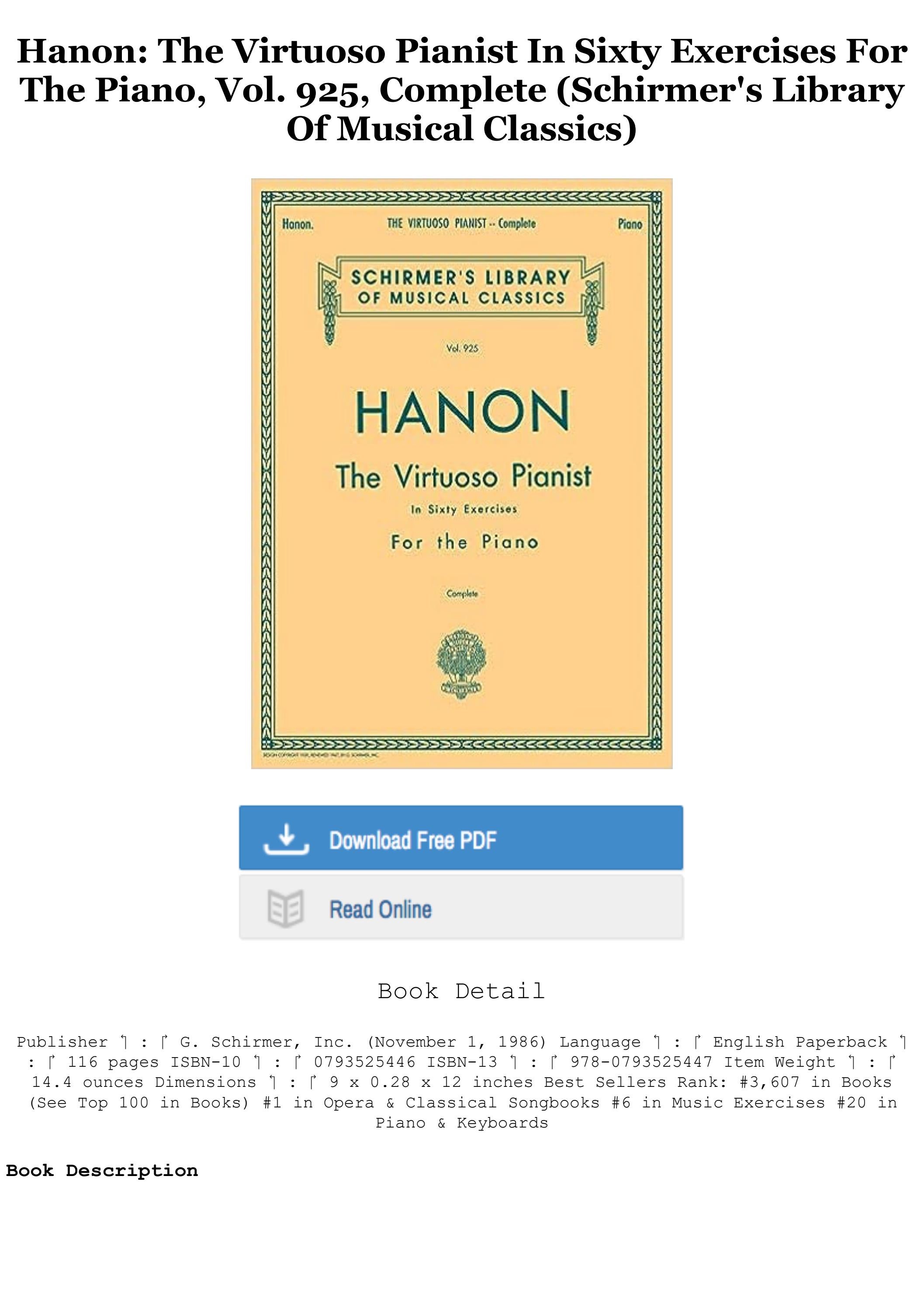 Le célèbre ouvrage de technique pianistique Le pianiste virtuose en 60 exercices: 3ème partie ? exercices 44-60, calculés pour acquérir l'agilité, l'indépendance, la force et la plus parfaite égalité des doigts ainsi que la souplesse des poignets par Charles-Louis Hanon permettra à tous... Troisième livre de la série de trois livres pour piano de Hanon Le Pianiste Virtuose en 60 Exercices. Ce livre ne contient que les exercices 44-60. Read more Report an issue with this product or seller Print length 51 pages Language French Publication date October 3, 2023 Dimensions 8.5 x 0.12 x 11 inches ISBN-13 979-8863291741 See all details Le Pianiste Virtuose Hanon HANON LE JEUNE PIANISTE VIRTUOSE La Virtuose Le Pianiste Virtuose, part II B (scales and arpeggios) sheet music for piano sol