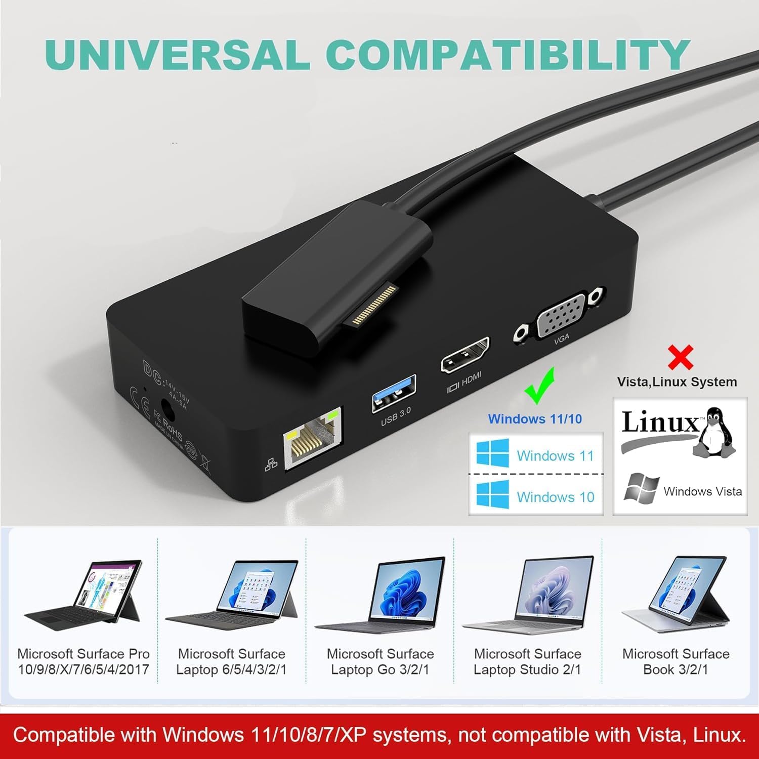 Un gain de temps considérable et un confort accru. Le Microsoft Surface Dock Hub 12-en-1 offre une connectivité pratique pour un espace de travail étendu ; connectez un ordinateur portable Windows avec jusqu'à 3 écrans et atteignez trois écrans (HDMI HDMI VGA). Cette station d'accueil Surface Pro offre d'excellentes... (Veuillez brancher la station d'accueil Surface correctement, en respectant le sens de connexion., ) Le port VGA prend en charge des résolutions d'affichage jusqu'à 1920 x 1080 à 60 Hz. Dock Surface Triple écran Surface Dock Triple Display(4K HDMI+VGA),11 En 1 Surface Station D'accueil Avec Alimentation,Surface Dock Pour Microsoft Surface Pro Surface Pro 7 Elle assure une connexion réseau plus stable. Station d'accueil Microsoft Surface 12 en 1 polyvalente : Équipée de la technologie Surface Connection, cette station d'accueil Microsoft Surface offre une connectivité complète pour tous vos périphériques : 2 ports HDMI 4K à 30 Hz, 1 port VGA 1080p à 60 Hz, un port Ethernet RJ45 100 Mbps, 2 ports USB-C, 2 ports USB-A 3., 0, un emplacement pour carte SD/TF, une prise casque 3,5 mm et un port d'alimentation CC. La station d'accueil Surface offre un débit de 10/100 Mbit/s via le port Ethernet RJ45, ce qui permet de télécharger des films et des fichiers plus rapidement, et de réduire la latence. 【Contenu de la livraison】1 station d'accueil Surface, 1 adaptateur secteur, 1 manuel d'utilisation et notre garantie de 12 mois. Pour toute question, n'hésitez pas à nous contacter. La prise HDMI 4K prend en charge des résolutions allant jusqu'à 3840 x 2160 à 30 Hz. Vous pouvez y connecter un clavier, une souris, une clé USB, des disques durs USB C, etc. Le Microsoft Surface Dock Hub 12-en-1 offre une connectivité pratique pour un espace de travail étendu ; connectez un ordinateur portable Windows avec jusqu'à 3 écrans et atteignez trois écrans (HDMI HDMI VGA Sortie HDMI 4K Ultra HD et station d'accueil Surface à triple affichage : La station d'accueil Microsoft Surface à triple affichage (4K HDMI + HDMI + VAG) avec modes étendu et miroir multiplie par trois votre efficacité. Nous sommes là pour vous. Microsoft Surface Dock avec trois écrans Double Guadeloupe