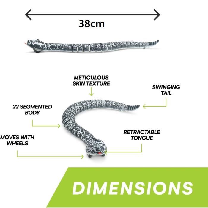 Le serpent cobra télécommandé a une queue oscillante et une langue rétractable. Sa texture 3D et ses couleurs vives rendent le jouet plus réaliste et attrayant. ✅Le serpent cobra télécommandé présente un design réaliste avec une texture 3D et des couleurs vives. Temps de charge : ≤ 20 minutes. 🐍[Magnifique cadeau] : Le serpent télécommandé est emballé dans un coffret cadeau coloré et peut être offert à la famille et aux amis dès sa réception. Ses bords lisses et son électronique intégrée garantissent un jeu en toute sécurité pour les enfants. Spécifications du produit : Nom : Serpent télécommandé Matériau : ABS + composants électroniques Dimensions du colis : 23 x 14,5 x 7 cm Longueur : 44 cm Couleur : Noir Temps de charge : environ 20 minutes Autonomie : environ 30 minutes Portée de la télécommande : environ 15 mètres Contenu du colis : 1 x Serpent télécommandé 1 x Télécommande 1 x Câble de charge USB 3 x Piles bouton Remarque : 1., Le serpent télécommandé ne fonctionne pas sur les tapis, mais uniquement sur les surfaces dures comme le carrelage et le parquet., 2., Ne faites pas tourner manuellement les roues du serpent cobra télécommandé lorsqu'il est à l'arrêt afin d'éviter d'endommager les composants internes., 3., Le serpent télécommandé passe en mode veille après 1 minute. ✅Fabriqué en ABS de haute qualité et sûr, avec des composants électroniques intégrés, ce jouet est sans danger pour les enfants. Grandado FR Informations sur Grandado FR Sponsorisé Jouet serpent télécommandé à infrarouge, tour électrique, jouet de Simulation, Animal Cobra, Spoof Cobra, modèle P0S9 34.49 EUR Prix mis à jour le: 03-09-2025 00:03:36 Voir l'offre Activez l'interrupteur situé en bas pour commencer à jouer. Le jouet se recharge via le port USB. Description du produit À propos de notre serpent télécommandé : ✅Ce serpent télécommandé présente une conception segmentée, un montage et un démontage faciles, un transport facile et un encombrement réduit. Top Race RC IR Télécommande infrarouge Slithery Snake Rake Serpent Serpent créature Prank Toy Une fois le mode veille activé, appuyez sur le dos du serpent pour le réactiver. ✅Ce serpent cobra télécommandé est joliment emballé et réaliste. C'est un excellent cadeau pour les amis et il est également idéal pour les fêtes, les farces, les interactions avec les animaux ou pour se détendre. 🐍[Matériau de haute qualité] : Le serpent télécommandé est fabriqué en ABS de haute qualité, sûr, non toxique et inodore. Ne convient pas aux enfants de moins de 3 ans, veuillez l'utiliser sous la surveillance d'un adulte Caractéristique: 1. Simulation conçoit la modélisation, avec une langue rétractable lors de la marche, pour attirer l'attention des enfants. 2. Moteur haute... Serpent Télécommandé Rechargeable USB Jeu Loup Garou Serpent Télécommandé HIULLEN - Cobra Réaliste 39cm Avec Langue Rétractable Lézard Télécommande Geko Lezard Radiocommandé Avertissement De Sûreté Contient de petites pièces. 🐍[Facile à utiliser] : Le serpent télécommandé est contrôlé par une télécommande. ✅Ce serpent télécommandé est doté d'un moteur haute performance, d'une puissance élevée, de pneus résistants à l'usure, d'une longue durée de vie, d'une portée de télécommande allant jusqu'à 15 mètres et d'une réponse sensible.