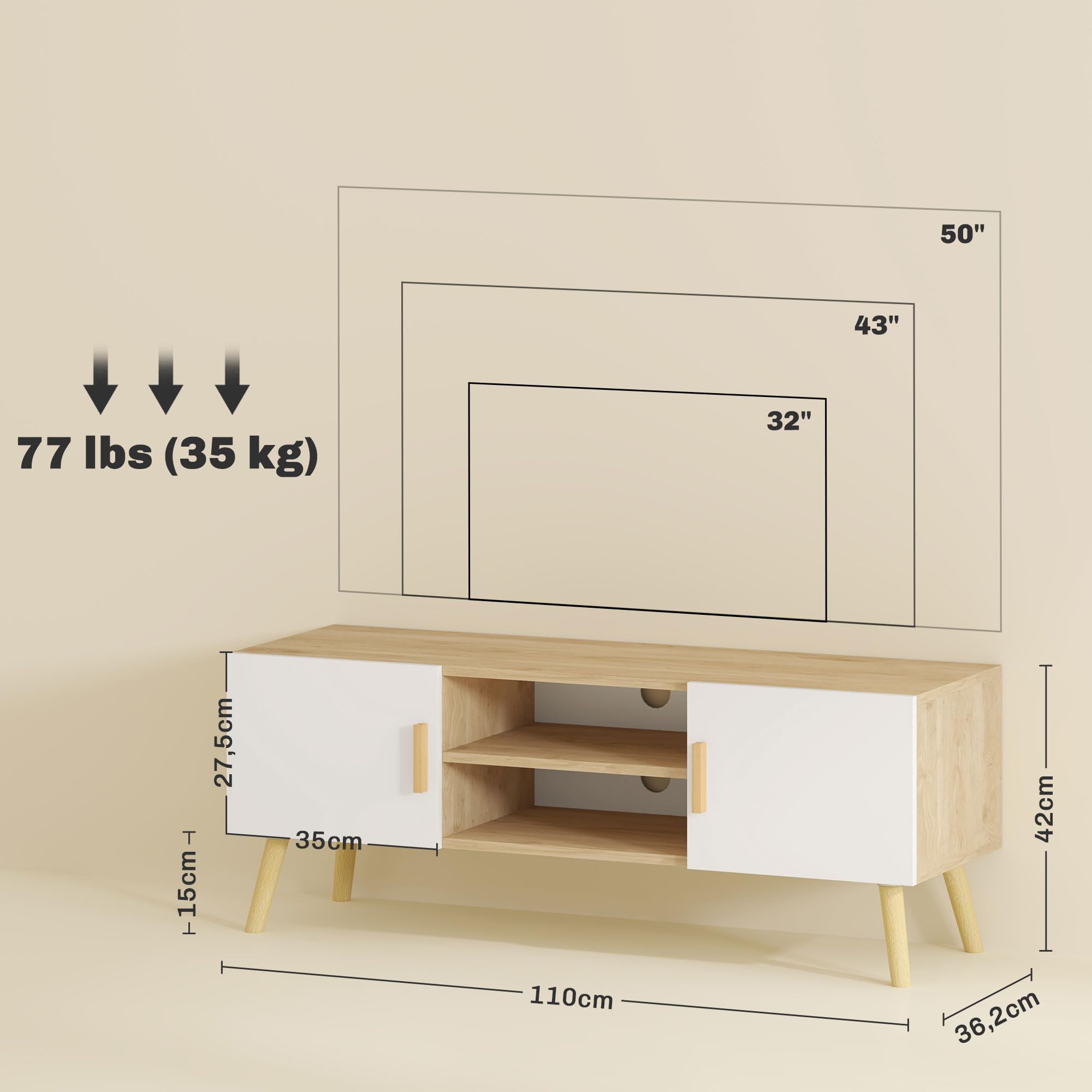 du trou pour câbles : Ø 6 cm ● Hauteur des pieds : 15 cm ● Charge max. Televisione 50 Pollici Meuble TV HOMCOM 110x42x36,2 Cm - Bois Chêne Avec 2 Placards Et Étagères - Support TV Jusqu'à 50 Pouces - Passe-câbles Intégré Meuble Tele Chambre CABLE MANAGEMENT SYSTEM : Équipé de deux passe-câbles, ce meuble TV en bois garde vos câbles parfaitement organisés, assurant un espace de divertissement épuré et ordonné. Meuble Tv Avec Passe-câbles HOMCOM Meuble TV Meuble Télé Bois Banc TV Jusqu'à 50 | WhichOne Meuble Television 50 Pouces totales : 110L x 36,2l x 42H cm ● Dim. recommandée : 35 kg (total), 15 kg (dessus), 5 kg (étagère/placard) ● Réf. Meuble TV mural HOMCOM banc TV jusqu'à 50 pouces avec compartiments... recommandée : 35 kg au total, 15 kg sur le dessus, 5 kg par étagère ou placard., Montage nécessaire. SPACIOUS STORAGE : Offrant deux placards et deux étagères ouvertes, ce meuble TV est l'endroit idéal pour ranger tous vos indispensables multimédias. Test du meuble TV HOMCOM : design et praticité pour téléviseurs jusqu'à 70 Adapté pour des téléviseurs jusqu'à 50, nécessite un montage mural pour les modèles plus grands. MODERN CHIC : Alliant un ton chêne rustique et une finition noire épurée, ce meuble de télévision apporte une touche sophistiquée et moderne. L'étagère centrale amovible permet une personnalisation de l'espace selon vos besoins. Descriptions Longues:Optimisez votre salon avec ce meuble TV avec rangement HOMCOM pour écrans de 50 pouces, offrant deux étagères et armoires pour vos films et livres, plus deux passages de câbles pour une organisation sans encombrement. Sa base surélevée et son revêtement en mélamine simplifient les tâches de nettoyage et d'entretien.
