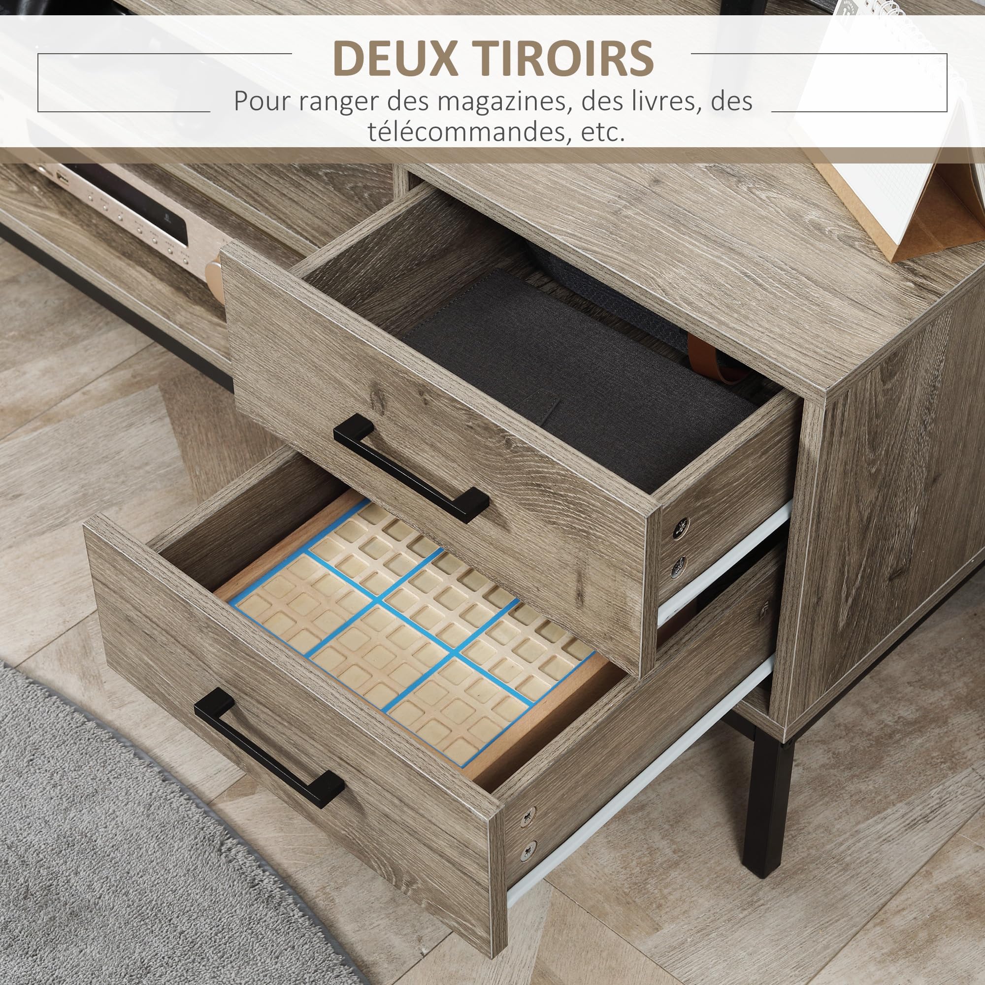 CAPACITÉ SPACIEUSE : Conçu pour des télévisions de 55 à 75, ce meuble TV en bois d'ingénierie offre un espace optimal avec trois étagères ouvertes et trois grands tiroirs, idéal pour ranger appareils multimédias, consoles de jeux, DVD et plus encore Ses pieds antidérapants assurent une bonne stabilité tout en protégeant les sols des rayures Le nettoyage de sa surface lisse est aisé, permettant de maintenir son aspect neuf avec minimal effort Fabriqué en panneau de particules et en métal pour plus de durabilité BESTBanc TV Meuble Télé avec porte Blanc 102x30x36 cm fr8459 DESIGN MODERNE ET ÉLÉGANT : Avec son allure minimaliste, ce banc TV s'intègre parfaitement à un décor contemporain, ajoutant une touche d'élégance raffinée. Ce meuble TV avec rangement convient aux téléviseurs de 55 à 75 pouces HOMCOM Meuble TV console de rangement armoire media avec 3 étagères... recommandée : 50 kg (total), 20 kg (surface supérieure), 5 kg (par étagère/tiroir) Rehaussez votre salon avec le meuble TV HOMCOM pour téléviseurs de 55 à 75 pouces, avec trois étagères ouvertes, des tiroirs, et un passage de câbles intégré. ASSEMBLAGE SIMPLIFIÉ : L'installation de ce meuble TV est facilitée grâce à des instructions claires et des pièces clairement marquées. Meuble TV HOMCOM Pour Téléviseur 55" Avec Lumières LED | Home Depot Canada Meuble TV Blanc BESTBanc TV Meuble Télé avec porte Blanc 102x30x36 cm fr8459... SPÉCIFICATIONS DU MEUBLE TV : Dim.