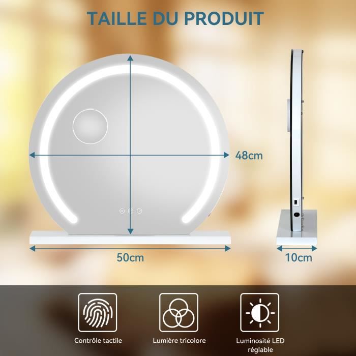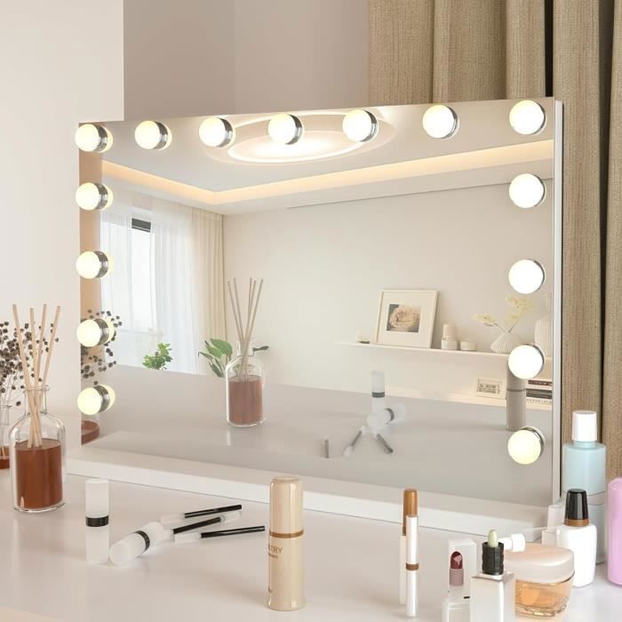 Deux Méthodes D'installation : ce miroir de maquillage peut être installé comme unité de bureau autonome ou fixé au mur pour gagner de la place. FENCHILIN Coiffeuse HOMCOM Miroir Maquillage Hollywood Lumineux LED Tactile - 3 Modes éclairage, Inclinable, Adaptateur - Métal Blanc Verre Pas Cher Miroir Coiffeuse Led 1., Les boutons tactiles intelligents du miroir de maquillage vous permettent de basculer facilement entre 3 couleurs de lumière (chaude/naturelle/froide)., 2., pour simuler la lumière du jour, de la nuit ou du bureau afin que vous puissiez créer le look de maquillage parfait dans n'importe quel environnement. iroir Avec éclairage LED Coycaa Salle De Bain, 54% OFF Le miroir de maquillage est doté d'un verre haute définition incassable, garantissant une surface claire et esthétique. Le miroir de maquillage éclairé est durable et résistant aux chocs Miroir de courtoisie éclairé, miroir de courtoisie avec 12 ampoules LED... Miroir Grossissant 10x : Le miroir est équipé d'un miroir grossissant 10x amovible, parfait pour les détails du maquillage, l'eyeliner et la mise en forme des sourcils. Éclairage intelligent réglable : ce miroir de maquillage dispose de 3 modes d'éclairage et d'une luminosité réglable. Fonction Mémoire : ce miroir de maquillage éclairé dispose d'une fonction mémoire qui rétablit les réglages d'éclairage à la température de couleur et à la luminosité définies en dernier, en fonction de vos habitudes d'utilisation. Miroir Coiffeuse Hollywood -NHHF- 18 LED-Smart Bluetooth-3 Couleurs Réglables-Charge USB-Loupe 10x-Type-C -1 Ampoule de - Maison Le bouton tactile intelligent du miroir de maquillage vous permet de passer facilement d'une couleur à l'autre (lumière chaude/lumière naturelle/lumière froide), afin que vous puissiez créer le look parfait dans n'importe quel environnement Le miroir de maquillage intelligent dispose de trois boutons tactiles à l'avant, et vous pouvez l'allumer et l'éteindre en cliquant sur le bouton d'alimentation
