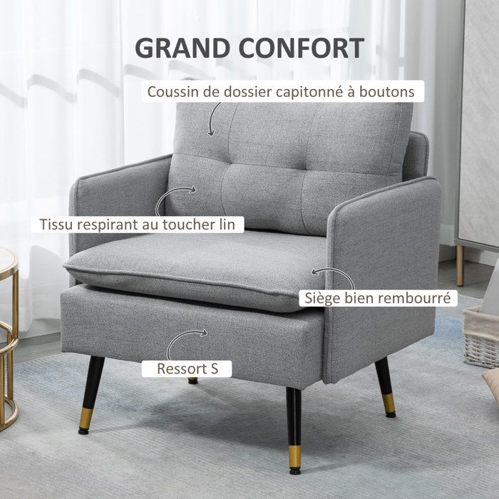 Fauteuil Capacité 120 Kg Montage Nécessaire Fauteuil Relax Avec Pouf - HOMCOM - Siège Pivotant à 360° - Dossier Inclinable - Polyuréthane - 75 X 84 X 100 Cm - Gris Fauteuil Scandinave Fauteuil accoudoir au meilleur prix | Leroy Merlin Spécifications: · - Couleur : gris · - Matériaux : tissu aspect lin (100% polyester), bois de bouleau, rembourrage mousse · - Dimensions totales : 65l x 79P x 98H... Son design élégant et épuré convient parfaitement à tout salon, chambre, bureau ou dortoir. Léger et compact, il est aisé à transporter et idéal pour enrichir votre confort au quotidien. 833-816V00CG● Note: Si vous souhaitez la reprise de votre ancien produit, merci de consulter nos CGV sur les modalités de reprise et de nous joindre via la messagerie. Descriptions Longues:Découvrez le fauteuil HOMCOM, paré de lin et soutenu par un cadre robuste en bois. STYLE ÉLÉGANT ET INTEMPOREL : Ce fauteuil de salon avec son revêtement effet lin et son cadre en bois en forme de C apporte une note chic à votre salon ou chambre STRUCTURE ROBUSTE ET DURABLE : Fabriqué avec un cadre en bois massif, ce fauteuil pour chambre garantit stabilité et sécurité avec une capacité de charge jusqu'à 120 kg SPÉCIFICATION : Ce fauteuil de salon mesure 65l x 79P x 98H cm, supporte 120 kg maximum et nécessite un assemblage Fauteuil de salon HOMCOM avec surface en lin et cadre en bois. Design sobre et chic, idéal pour salon, chambre, bureau, dortoir. Légère et compacte, facile à déplacer. Parfaite pour ajouter du confort au quotidien. Nos décorateurs vous aident à imaginer votre intérieur