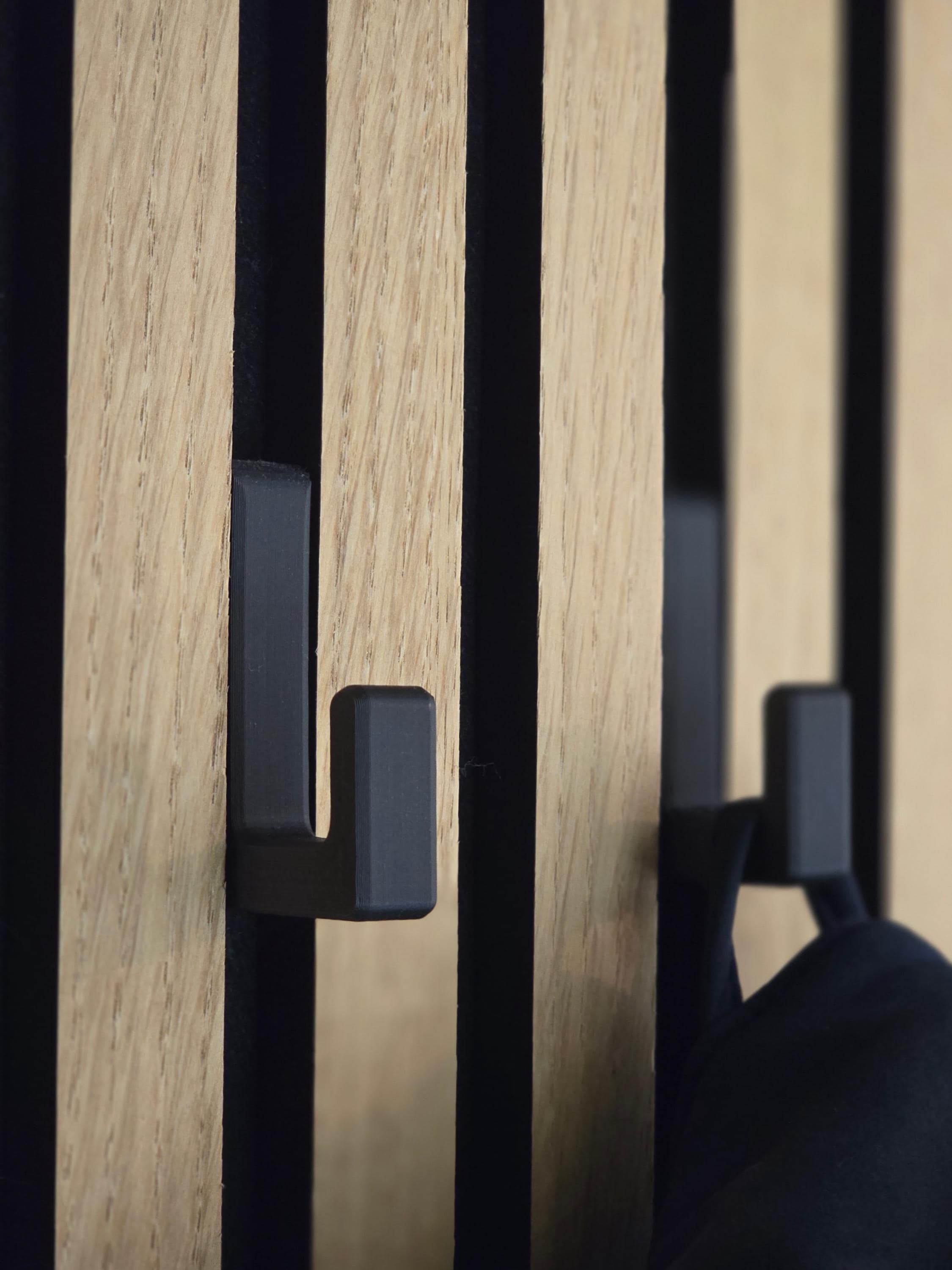Étagère De Rangement Noire Avec 5 Crochets En Acier - Fixation Facile Sur Panneau Mural Acoustique Vis Incluses 96844693 Crochet Vestiaire Design HOME DELUXE Crochets Pour Panneau Acoustique SCAF 10 X 5 X 5 Cm Lot De 10 I Crochets Muraux Crochets Pour Vetements Crochets Pour Vestiaires 93182501 Etagere Pour Panneau Tasseau Bois Crochets pour panneaux acoustiques – Suspension solide, assemblage facile, décoration murale moderne, idéal pour le studio et la maison, sans perçage. Acoustique - Fixation verrouillable, belle, sans dommage et amovible sur tous les panneaux acoustiques courants. Avec vis M5x16 en noir Adaptation parfaite : Avec un profil fin de 13 mm, ce crochet de vestiaire s'intègre harmonieusement entre les lattes en bois des panneaux acoustiques, préservant l'esthétique élégante de votre mur sans compromis Crochet Mural Design Noir – Fixation Facile sur Panneaux Muraux... Matériau haut de gamme : Conçu en métal solide avec une finition noire élégante, ce crochet allie durabilité et style moderne, apportant une touche sophistiquée à vos panneaux muraux Double fonctionnalité : Ce crochet pratique à double accroche offre deux points robustes pour suspendre manteaux, sacs et accessoires, optimisant l'organisation et l'espace dans votre intérieur