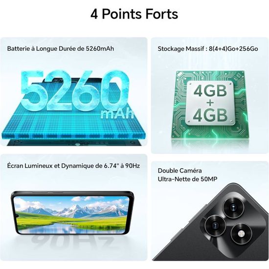 Équivalent à 8Go de RAM Équivalent à 4+4Go RAM Turbo d’HONOR, pour une fluidité durable sans ralentissement. S’adapte auto aux scènes, permettant à tous de prendre de belles photos sans compétences pro. HONOR X5c Plus : jusqu’à 4 Go RAM + 128 Go stockage — suffisant pour 30 000+ photos, 12 000+ morceaux ou 100+ films. 【Grand espace & Perf RAM Turbo】Plus de stress pour l’espace ! Il dispose d’outils de protection oculaire (Dynamic Dimming, DC Dimming, etc. 【Écran de 6,74 pouces 90Hz & design élégant durable】Profitez d’une vision immersive avec l’écran TFT-LCD de 6,74 pouces — fréquence de 90Hz pour le défilement/vidéos fluides, 450 nits de luminosité pour une clarté au soleil. écran 6.74 Pouces 90Hz Batterie 5260mAh HONOR X5c Plus Smartphone Dual SIM NFC, 5260mAh Batterie, 4 Téléphone 128 Go Extensible Buy Honor X5c Plus Smartphone, 128 GB, Midnight Black, Dual SIM, 4 L’AI booste les résultats : reconnaissance d’objets isole sujets/nettoie arrière-plans ; AI Sharpness garde textes/documents clairs. Mode Éco-Énergie Super IA : restez connecté heures avec seulement 2 % de charge. Le téléphone a une épaisseur de 7,89mm, un poids de 186g et une construction ultra-résistante aux chocs, passant les tests stricts pour les impacts quotidiens. 50MP rear camera and 5MP front camera. 5260 mAh battery; 15W fast charging; 4G connection. €88.00. In stock 65 unit... 【Double appareil photo AI 50MP : photos nettes】Capturez moments avec détails pro via le système photo HONOR X5c Plus : 50MP principal arrière (f/1., 8), 13MP auxiliaire et 5MP frontal pour selfies nets. Magic Capsule permet un accès immédiat aux fonctions clés avec un tap sur les notifications. ) pour réduire la fatigue oculaire. HONOR X5c Plus 4G Sartphone, 4GB RA 128GB RO, Dual SI, 5130Ah... 【Expérience fluide MagicOS 9., 0 & double déverrouillage】L’HONOR X5c Plus fonctionne avec MagicOS 9., 0 (basé sur Android 15) doté d’une interface fluide. Les captures d’écran au doigt (Knuckle Screenshots) améliorent la productivité, rendant l’usage quotidien simple. Piloté par processeur MediaTek Helio G81 (8 cœurs), il délivre de bonnes perf pour surfing et jeux légers, sans lag.
