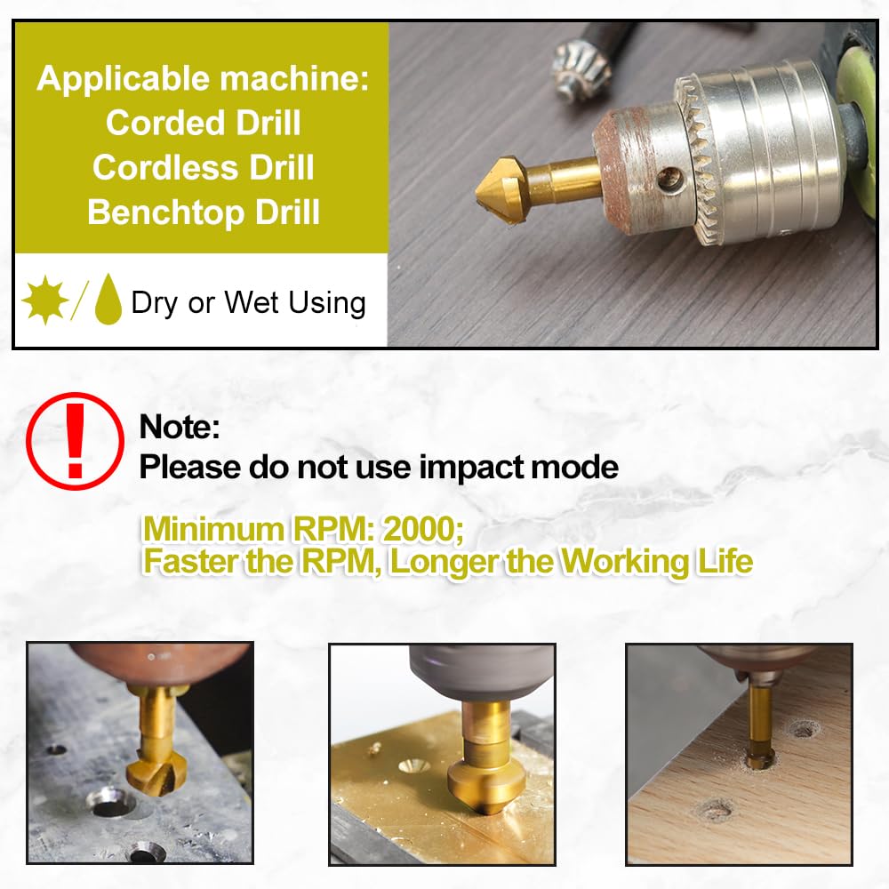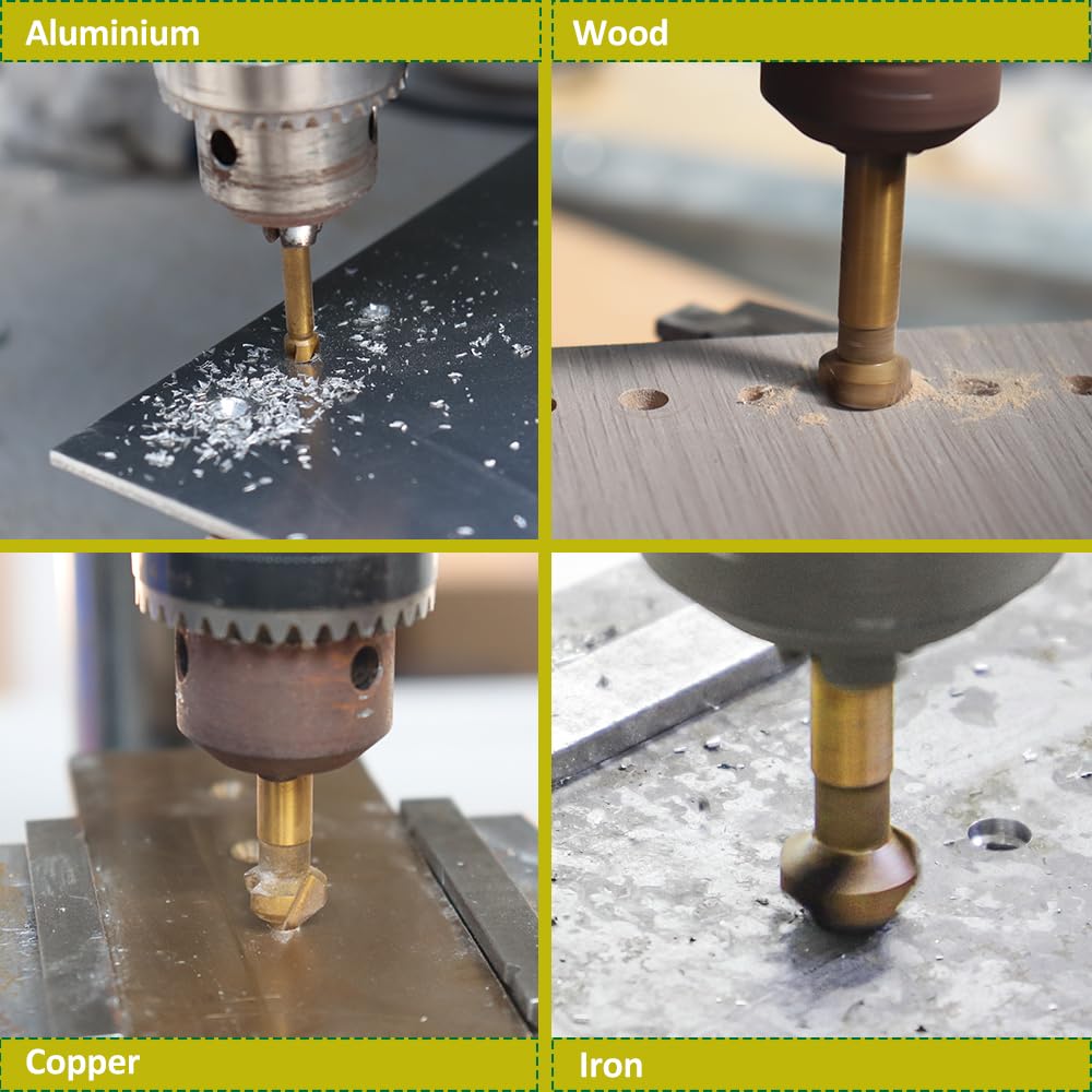 Fraise à Chanfreiner HSS ValueHall Fraise à Chanfreiner 6pcs HSS Fraise A Noyer Foret Conique Fraise Metal Convient aux pièces d'une dureté inférieure à 65HRC, telles que l'acier inoxydable, la plaque d'aluminium, l'acier au carbone, la plaque de fer fine, le panneau isolant, le panneau de PVC, le panneau de bois, etc.2 Fraises a chanfreiner hw hw 30° ofk 500 490091 - Séguret Décoration 【M2 Acier rapide de qualité industrielle】Dureté, tranchant et résistance à l'usure exceptionnels, garantissant une durée de vie plus longue et des performances fiables. Jeu de 3 forets fraise à étage coniques en acier HSS, dimensions de ø 4 à 32mm. Revêtement en titane pour réduire la friction et la chaleur. Idéal pour percer l... Utiliser une perceuse à main électrique : Vitesse de rotation minimale : 2000 ; plus la vitesse de rotation est élevée, plus la durée de vie est longue 【Application】Pour le perçage (fraisage) et le chanfreinage de divers matériaux, y compris l'acier inoxydable (épaisseur de 1 mm ou moins), le cuivre, l'aluminium, le bois et le plastique. 【2-en-1 Fonctionnalité】Combine le perçage (fraisage) et le chanfreinage en une seule étape, ce qui permet d'économiser du temps et des efforts 【Spécifications】Total 6 pièces: 6,3/8,3/10,4/12,4/16,5/20,5mm; longueur totale 45/50/50/56/60/63mm; longueur de travail 6/8/9/10/13/17mm; Acier à coupe rapide