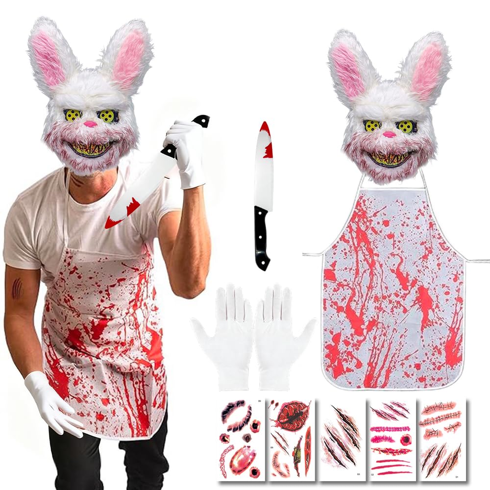 Costume lapin tueur Halloween - 5 pièces effrayantes Couteau du Boucher Tueur - Accessoire Halloween - Accessoire... Costume Halloween Lapin KDISHKRA Ours D'horreur Deguisement, Costume Ours Horreur, Deguisement Adulte Halloween, Masque D'Horreur Pour Halloween Tablier Ensanglanté Gants Couteau Tatouages Temporaires Et Faux Sang Masque Lapin 🐰 【Détails d'horreur authentiques】 Le costume de lapin d'horreur séduit par ses effets sanglants réalistes sur le tablier et la tronçonneuse. 🐰 【Confortable et respirant】 Le masque d'Halloween effrayant pour hommes est équipé de bandes élastiques qui s'adaptent à différentes tailles de tête. Costume de lapin homme - Déguisement adulte - v39325 | Atelier Mascarade Le masque d'Halloween effrayant soigneusement conçu vous donne l'apparence d'un véritable tueur de lapins terrifiant qui attirera à coup sûr tous les regards et réchauffera l'ambiance de toutes les fêtes. Les trous d'aération à l'intérieur assurent un confort optimal, tandis que le tablier réglable permet un ajustement personnalisé pour que vous puissiez vous sentir à l'aise toute la soirée. 🐰 【Large gamme d'applications】 Que ce soit pour les adultes ou les enfants, ce costume d'Halloween pour hommes est parfait pour les fêtes d'Halloween, les événements cosplay ou les soirées à thème. Le matériau est non toxique et doux pour la peau, ce qui fait de cet accessoire de costume le choix idéal pour les fans d'Halloween soucieux de l'environnement.
