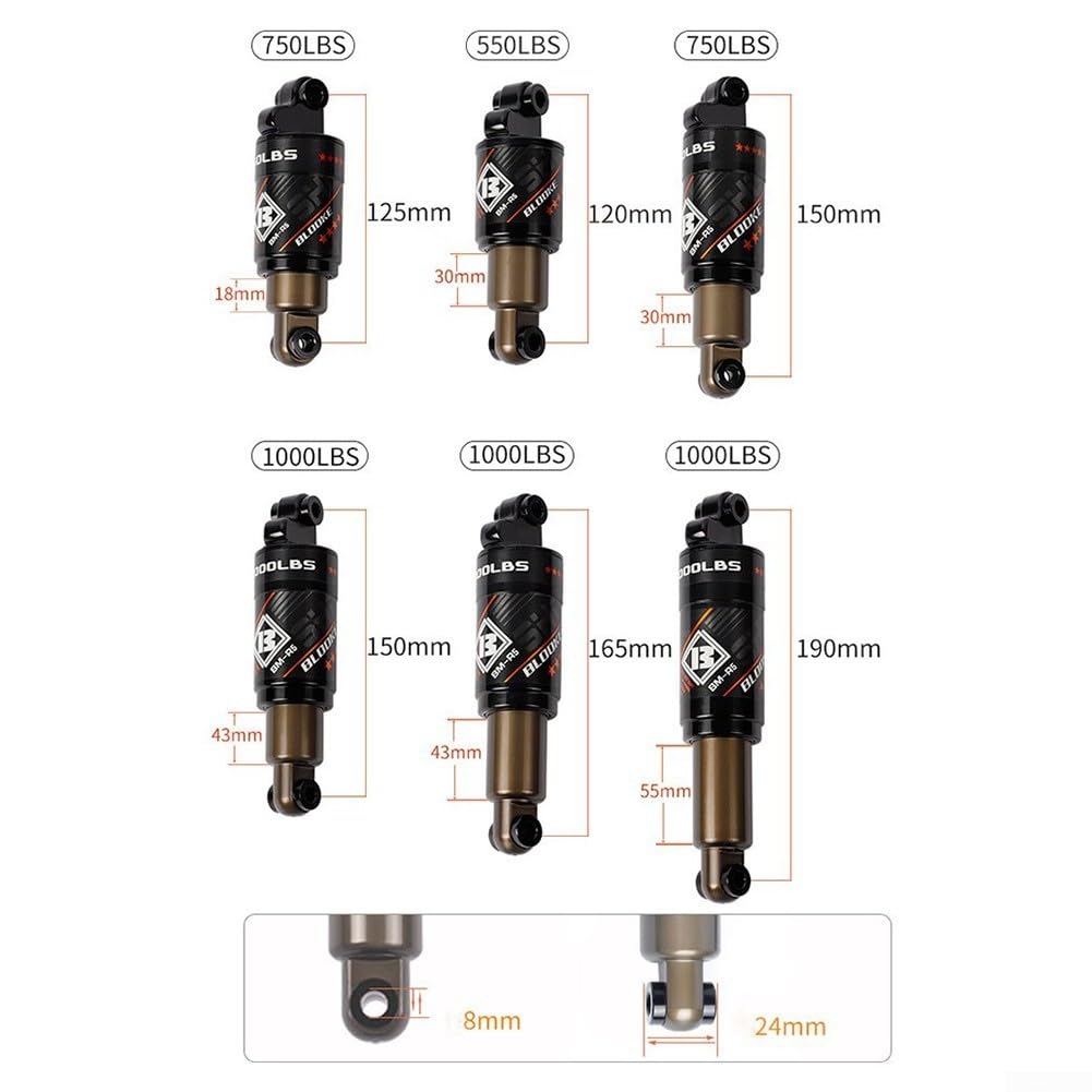 Caractéristiques : Nom : amortisseur de ressort à huile. FOX Amortisseur - DHX - Factory | Coil | Metric | avec Ajusteur - 210x55mm Résistant à l'usure : l'amortisseur est construit avec des matériaux anti-usure et résistants à l'usure, assurant une performance durable. Suspension Arrière Légère Anti-bruit DISPOSITIF AMORTISSEUR RÉGLABLE En Hauteur Alliage D'aluminium Pour Amortisseur VTT Aluminium * Réduit le bruit, stabilise l'amortisseur tout en minimisant le bruit et en réduisant la pression de conduite. Spécifications de la bague : 24 mm., Spécifications : 120/150/165/190 mm., Poids : 125 mm, 258 g., 125 mm, 340 kg : 270 g., 150 mm, 340 kg : 330 g., 150 mm, 453,6 kg : 350 g., 165 mm, 453,6 kg : 360 g. Aortisseur arrière pneuatique HLT-190 453,6 kg - En étal - Pour VTT... Chaque taille est soigneusement conçue pour offrir une absorption optimale des chocs selon vos besoins. Fiable et réglable : fabriqué en alliage d'aluminium de haute qualité, cet amortisseur arrière de vélo offre un excellent ajustement. Amortisseur arrière pour vélo électrique, 125-190 mm, 453,6 kg, pour VTT (165 mm, 453,6 kg) Amortisseur arrière réglable : fabriqué en alliage d'aluminium léger, cet amortisseur arrière offre un excellent ajustement, vous permettant de personnaliser votre expérience de conduite Contenu du paquet : 1 amortisseur arrière., 1 vis à sac. 190 mm - 453,6 kg : 380 g. Il est conçu pour réduire le poids et fournir des performances optimales. Description : * Fabriqué en matériaux de haute qualité, alliage d'aluminium. Il est léger, réduisant la charge générale de la conduite.