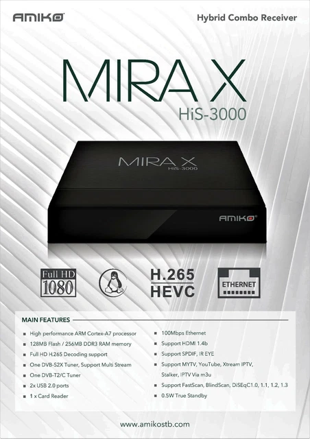 Alles over de Amiko Mira X 4200 Linux IPTV Box Récepteur Média Amiko Mira X-5200bt Amiko MiraX HiS-4100 Linux Alapú Médialejátszó, TV Okosító Récepteur Media Streaming Amiko Mira X‑5200 BT – Streamer multimédia TV Linux – Édition Bluetooth L'Amiko Mira X‑5200 BT est un récepteur IPTV 4K Ultra HD avancé qui fonctionne sur une plate-forme Linux stable. Ce lecteur multimédia est conçu pour un fonctionnement fluide, une navigation rapide et des performances fiables Mémoire flash : 8 Go, RAM : 1 Go DDR3, Hisilicon Quad-Core ARM Cortex A53 1,2 GHz Alles over de Amiko Mira X 4200 Linux IPTV Box Ethernet 100 Mbps et WiFi double bande 2,4 G/5 G Télécommande infrarouge et Bluetooth avec rétroéclairage