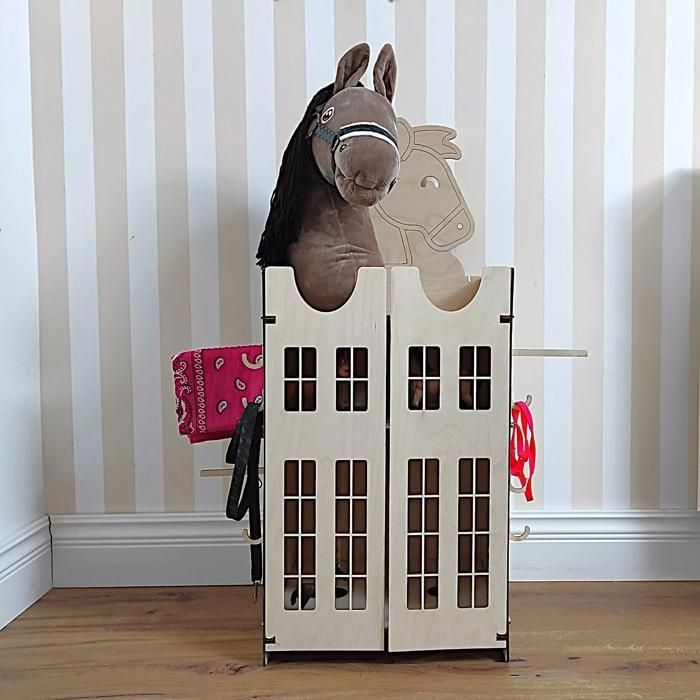 Box Hobby Horse Hobby Horse Gris à Longue Crinière Et Queue Amovible Support Pour Chevaux Bâton Hobby Horse Palomino des Hautes Plaines - Sun Dancer Écurie pour 2 chevaux - Hobby Horse World Fabriquée en MDF de 3 mm d'épaisseur, cette écurie avec légère mais robuste allie fonctionnalité et charme. Le panneau arrière est décoré d'un motif unique en forme de tête de cheval, renforçant son attrait esthétique. Options de rangement polyvalentes Les côtés du support pour hobby horse sont équipés de fentes réglables pour accrocher des supports et crochets, permettant une organisation flexible. Écurie avec pour 2 hobby horse – Support pour hobby horse – Écurie avec portes, crochets et supports Offrez à vos hobby horse une maison confortable et bien organisée avec cette écurie avec blanche conçue pour deux hobby horse. Largeur : 32 cm (12,6 pouces) Hauteur : 76 cm (29,9 pouces) Profondeur : 28 cm (11 pouces) MDF de haute qualité, léger & résistant – Conçu en MDF de 3 mm, cette écurie hobby horse est solide et durable. Système de rangement ajustable – Comprend 4 longs supports et 8 crochets, parfait pour organiser rênes, brosses et accessoires. Cette écurie en bois MDF pour 2 chevaux stick est à la fois pratique et décorative. Facile à monter elle permet de ranger les accessoires et de recréer un...