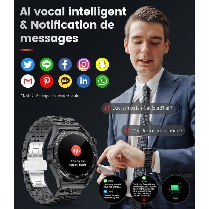 📞【Appels Bluetooth et Notifications】Compatible avec Android et iOS, cette montre vous permet de passer et recevoir des appels, ainsi que de consulter vos messages, e-mails et notifications des réseaux sociaux directement sur le poignet. Montre Connectée Homme avec Appels Bluetooth et Écran HD 1.85, Suivi de la Santé et Batterie 800mAh Smartwatch avec 100 Modes Sportifs Podomètre... ❤️【Au-delà de l'essentiel】La montre intelligente offre un suivi complet de la santé, vous permettant de surveiller votre état physique à tout moment. Vous disposez de 5 cadrans par défaut et de plus de 200 styles personnalisables pour exprimer votre personnalité, parfaitement adaptée aux activités quotidiennes. Smartwatch écran 1.85 Pouces Appels Bluetooth Montre Connectée Homme - Appels Bluetooth - Écran 1,85 Montre Connectée Homme Darty Grâce à l'application dédiée, vous pouvez suivre vos progrès et atteindre vos objectifs. ⚠️【Conseils de Port et Configuration des Bracelets】Avec un diamètre de cadran d'environ 52,6mm, ce modèle convient mieux aux poignets de taille moyenne à large. 🏄【Plus de 100 Modes Sportifs et Résistance à l'Eau 5ATM】Ce tracker de fitness prend en charge plus de 100 modes sportifs, en enregistrant avec précision des données comme les pas, la distance et les calories. Elle suit également automatiquement vos phases de repos nocturnes, en vous informant sur la qualité et la durée de votre sommeil. Remarque : les données sont fournies à titre indicatif uniquement et ne constituent pas des données médicales. Les bracelets de 24mm de large sont faciles à échanger selon les occasions. Équipée d'une batterie 800mAh en cobalt pur, couplée à un algorithme intelligent, elle optimise la durée de vie de la batterie et réduit la fréquence de charge, parfaite pour les utilisateurs actifs en extérieur. Elle est dotée d'un écran tactile HD, résistante aux chocs avec une autonomie de batterie de 15 jours et une batterie de 710 mA rechargeable en 60 minutes. Elle suit vos données de santé comme la fréquence cardiaque, la pression artérielle, l'oxygène sanguin et le suivi de sommeil La montre est livrée avec deux bracelets en silicone gris et noir, offrant confort, durabilité et résistance à l'eau, idéals pour le sport et un usage quotidien. Une garantie d'un an est incluse pour votre tranquillité d'esprit. Approvisionnement En Gros Smart Watch Imperméable Avec Appel Bluetooth, NFC Et GPS Fitness And Activity Tracker De Yftgbstore, 32,28 € | DHgate