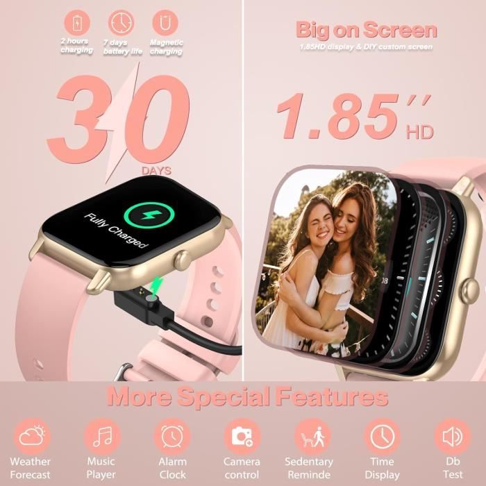 Rappel d'appel et de message Bluetooth : la montre connectée dispose d'un microphone et d'un haut-parleur intégrés. Appels Bluetooth et Rappels Intelligents : La montre connectée dispose d'un haut-parleur intégré et d'une connexion Bluetooth, permettant aux utilisateurs de passer et de répondre à des appels directement depuis leur poignet, fournissant ainsi des services d'appel pratiques pendant l'exercice. La montre smart watch peut également recevoir différents types de notifications comme Facebook... Mesurez votre volume d'entraînement et votre consommation de calories en temps réel pour vous aider à ajuster l'intensité de l'entraînement afin d'obtenir le meilleur effet d'entraînement. Dans le même temps, il peut également fournir des fonctions pratiques telles qu'un réveil quotidien, de la musique, des prévisions météorologiques, une caméra télécommandée, etc. Smartwatch écran 1.85 Pouces Montre Connectée Femmes Homme Avec Appel Bluetooth, 1.85" Hd Smartwatch Montre Connectée Smartwatch Plus de 100 modes sportifs et étanchéité IP68 : cette montre homme connectée prend en charge plus de 100 modes sportifs (course en plein air, cyclisme, saut à la corde, etc., ). Les montres intelligentes pour femmes et hommes utilisent un écran tactile haute définition de 1,85 pouces pour offrir une expérience visuelle haute définition sur grand écran. Une fois la connexion Bluetooth établie, vous pouvez répondre ou passer des appels directement sur votre montre à tout moment et en tout lieu. Et la montre sport a une conception étanche IP68, qui peut répondre pleinement à vos besoins quotidiens en matière d'étanchéité. Système de surveillance de la santé : la Montre Connectée Femme Homme dispose d'une technologie de capteur LC11S de haute précision intégrée, qui vous permet de surveiller la fréquence cardiaque/la saturation en oxygène du sang/le sommeil 24 heures sur 24, vous permettant de mieux comprendre votre santé physique. Les montres intelligentes pour femmes et hommes peuvent effectuer des appels Bluetooth et des rappels de messages, vous permettant de répondre/passer des appels de manière flexible et de recevoir chaque notification de message à temps. Vous avez le choix entre plus de 100 cadrans de montre en ligne dans l'application de montre connectée homme, et vous pouvez également personnaliser votre photo et la styliser à votre guise. Écran HD de 1,85 pouces et cadran personnalisé : la Montre Connectée Femme Homme dispose d'un écran couleur entièrement tactile de 1,85 pouces, offrant une expérience visuelle ultra claire et large Les montres pour femmes et hommes sont disponibles dans une variété de thèmes personnalisés et sont également équipées de deux types de bracelets interchangeables pour répondre à vos besoins individuels. Il peut être utilisé pendant 7 jours avec une charge de 2 heures et a une autonomie en veille de 30 jours. Montre Connectee Montre Connectée Homme Femme, 1.85 HD Smartwatch