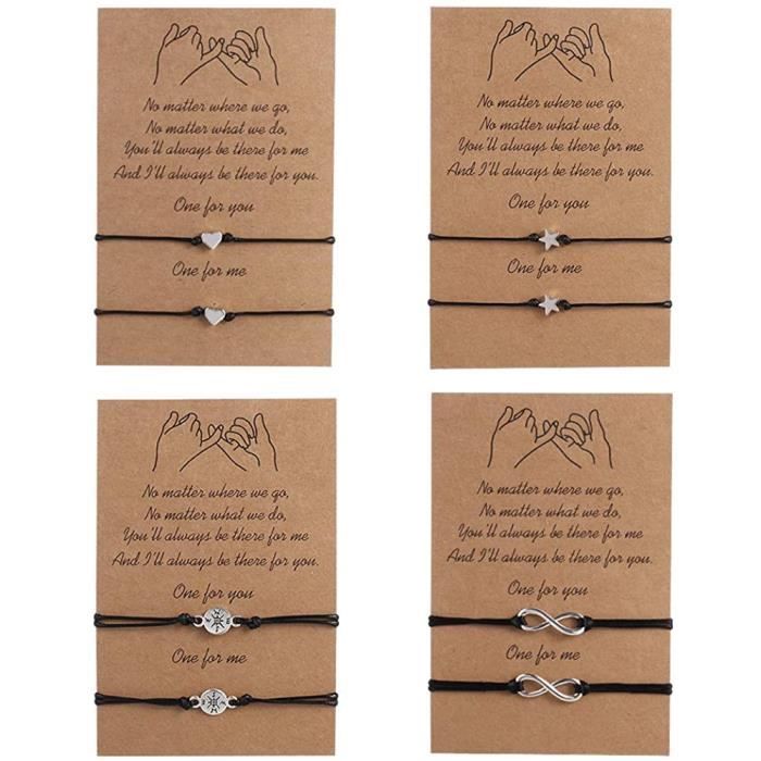 Bracelets Soleil Lune étoile 4 Paires Bracelets D'Amitié Pour Homme Femme Fille Garçon Bracelet Couple Réglable Avec Les Motifs Coeur Étoile Infini Boussole Bracelet Tressé à La Main Cadeau Pour Couple Famille Meilleurs Amis Idée Cadeau Meilleur Ami Cadeaux de bijoux idéaux: Ce bracelet est livré avec une carte de souhaits et un sac en flanelle. Excellent choix pour les anniversaires, Thanksgiving, Noël... Bracelet Couple Lune Soleil | Comme des Aimants Adapté : Convient à toute la famille, y compris les parents et les enfants, pour renforcer le lien entre les membres de la famille et partager des moments chaleureux Beau cadeau]Un produit contient une enveloppe une carte 3 bracelets soleil, lune et étoiles pochette en velours VU100. Joliment emballé et un cadeau... Excellente idée cadeau : ces bracelets conviennent aux familles, sœurs, couples et meilleurs amis, ce qui en fait un choix de cadeau parfait pour les relations amicales proches et familiales et pour exprimer des sentiments profonds. HAUTE QUALITÉ : Fabriqué à partir de matériaux de haute qualité pour garantir la durabilité et l'apparence du bracelet et le garder comme neuf au fil du tempsAjustable : Tirez sur le nœud pour ajuster la taille du bracelet. Ajustable : Tirez sur le nœud pour ajuster la taille du bracelet. Emballage : vous recevrez un lot de 3 bracelets soleil lune étoile.