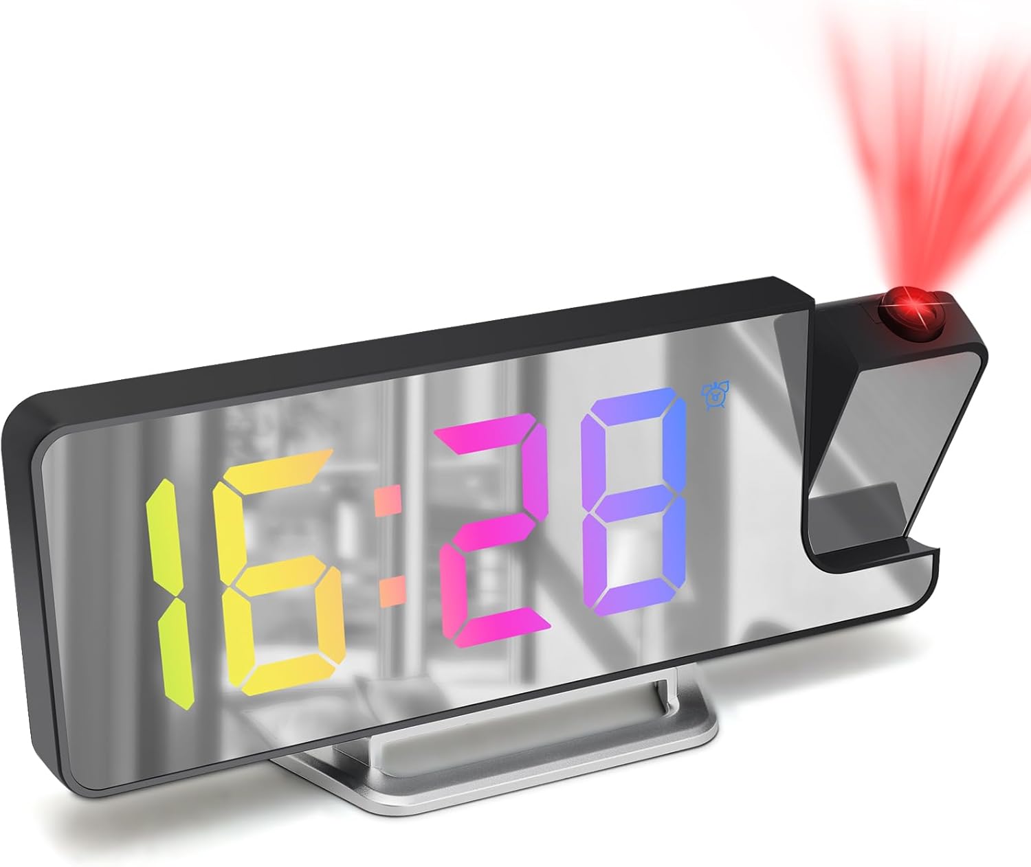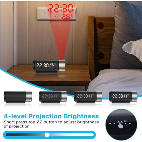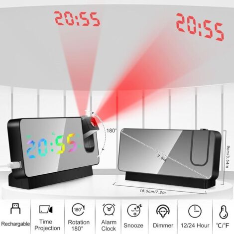 Thermomètre Hygromètre Numérique Horloge De Projection Pour Plafond De Chambre, Réveil Avec Projecteur | Hygromètre De Jauge De Moniteur D'humidité De Température,Alarme De Projecteur De Station Météo à Affichage LED Clair Pour Chamb Affichage Clair Jour/nuit Réveil à projection pour plafond de chambre, radio-réveil numérique Radio-réveil à projection pour plafond de chambre à coucher, double... De plus, il affiche une plage d'humidité comprise entre 20 et 90 %. SpécificationEst-ce double face : simple faceStyle: décontractéAspect : rectangulaireLieux applicables : salon, chambre, bureau, cuisine. Des visuels clairs partout : Bénéficiant d'un affichage ultra-clair, ce réveil à projection brille avec une clarté distincte sur toutes les surfaces, de 1 à 5 m, une projection claire à chaque fois. Notre réveil à projection dispose d'un affichage LED clair et d'un affichage ultra clair sur toutes les surfaces. Ajustement particulier : doté d'un bouton de mise au point réglable et d'un angle de projecteur de 180 degrés, profitez d'un affichage clair et net de l'heure à n'importe quelle distance avec le réveil à projection. Largement utilisé : suivez facilement l'heure et la température grâce à notre réveil à projection de pointe. Maintenez des conditions confortables : le réveil à projection surveille la température et l'humidité avec des capteurs de précision, affichant des valeurs de -9,9 C à 60 C et de 20 % à 90 %, afin que vous puissiez facilement suivre les conditions intérieures. Reveil Projecteur Plafond - La nuit, le radio réveil projection plafond projette une image HD rotative à 180 degrés sur le mur ou le plafond. Vous pouvez vous réveiller au milieu de la nuit et voir l'heure avec les yeux ouverts