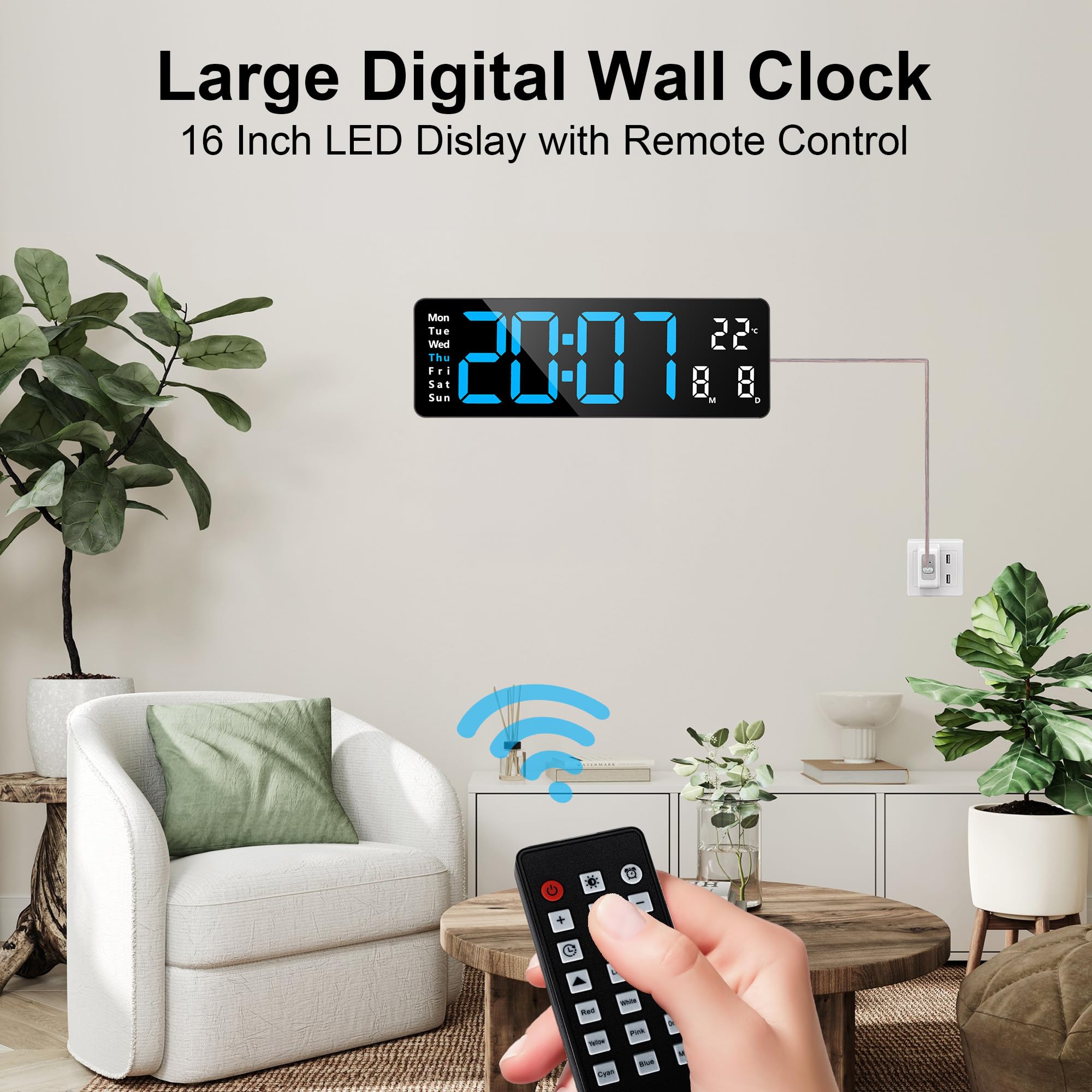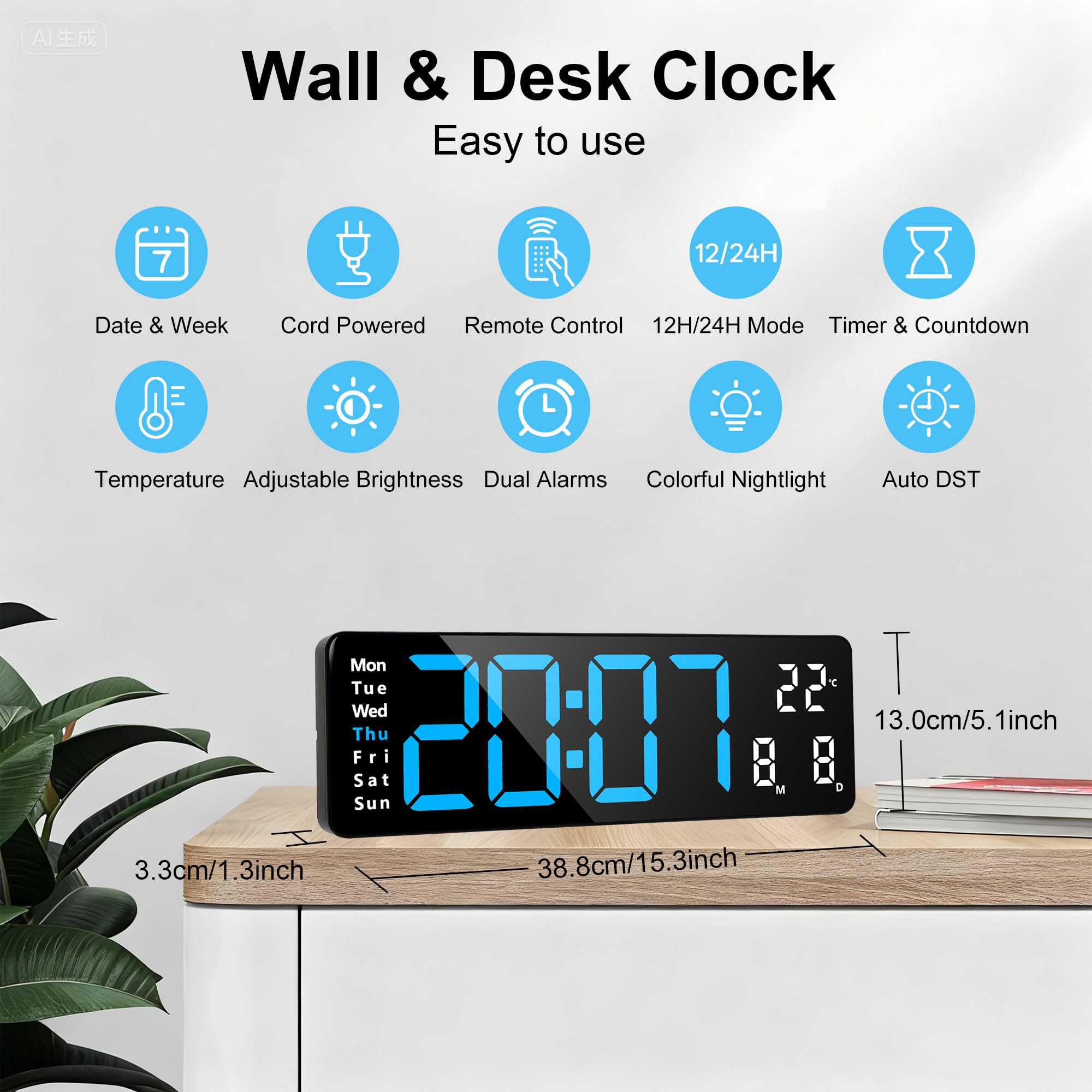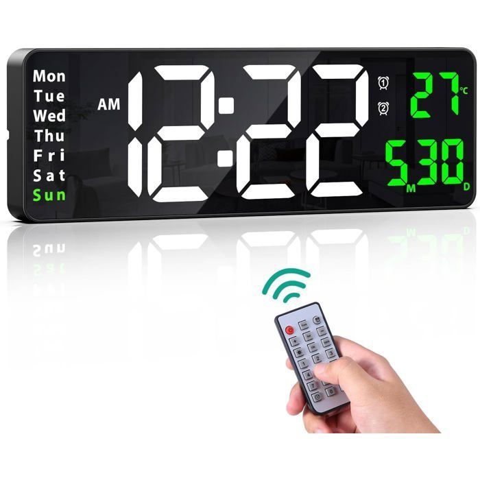 Et grâce à la télécommande pratique, vous pouvez facilement régler cette horloge murale numérique sans avoir à vous lever. Lafocuse Horloge murale numérique avec télécommande, écran LED de 13, grande horloge numérique avec luminosité réglable, compte à rebours et minuterie... Deux piles AAA (non fournies) permettent de maintenir la fonction mémoire en cas de coupure de courant, ce qui signifie que l'horloge n'a pas besoin d'être réinitialisée après le rétablissement du courant. Caractéristiques du produit : Matériau : plastique Style : moderne Couleur du cadre : noir Couleur de l'affichage des chiffres : bleu Taille : 16 pouces (38,8*13,0*3,3 cm) Le paquet comprend : 1 x horloge numérique 1 x câble d'alimentation USB 1 x télécommande 1 x mode d'emploi Remarques : 1., Veuillez noter que le produit ne fonctionne que lorsqu'il est connecté à un câble d'alimentation., 2., En raison de la mesure manuelle, une erreur de 1 à 2 cm peut survenir. Horloge Moderne Pour Salon Bureau Réveil 3D - Horloge Murale Numérique Led - Intensité Variable - Veilleuse - Usb - 12-24 Heures Horloge Avec Minuterie Compte à Rebours Il doit être utilisé avec le cordon d'alimentation (fourni) et un adaptateur secteur 5 V/2 A (non fourni). Lafocuse Grande horloge murale numérique à LED 16 pouces avec veilleuse Cette horloge numérique à LED est dotée d'une veilleuse colorée dans sa partie inférieure, qui diffuse une lumière douce la nuit ou dans l'obscurité. 【À Brancher】Ce produit ne fonctionne pas sur piles. 【Veilleuse Multicolore RGB】Personnalisez votre environnement grâce à la veilleuse inférieure incluse, qui offre 8 couleurs fixes et 1 option multicolore. 【10 Niveaux de Luminosité】Vous pouvez choisir parmi 10 niveaux de luminosité et éteindre l'écran pour éviter que la lumière ne vous dérange pendant votre sommeil. Vous pouvez régler deux alarmes à des heures différentes pour vous réveiller ou vous rappeler une tâche importante. Merci de votre compréhension., 3., Veuillez garder l'horloge numérique à l'écart des environnements humides et à haute température. Veilleuse Led 3D Manga Avec Télécommande Usb Rvb Changeant De Couleur... Alimentée par un câble USB, cette horloge numérique affiche clairement l'heure, la date, le jour de la semaine et la température, ce qui vous permet de lire l'heure facilement, même à distance. Elle dispose également d'une fonction photosensible qui ajuste automatiquement la luminosité de l'écran LED. Horloge murale numérique de 16 pouces en 8 couleurs, grande