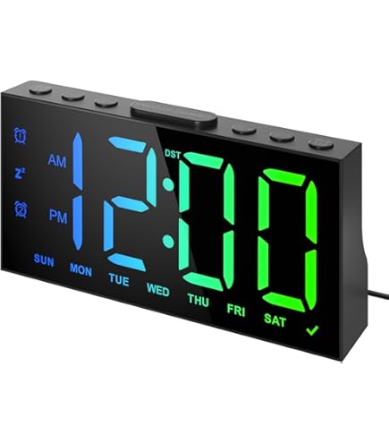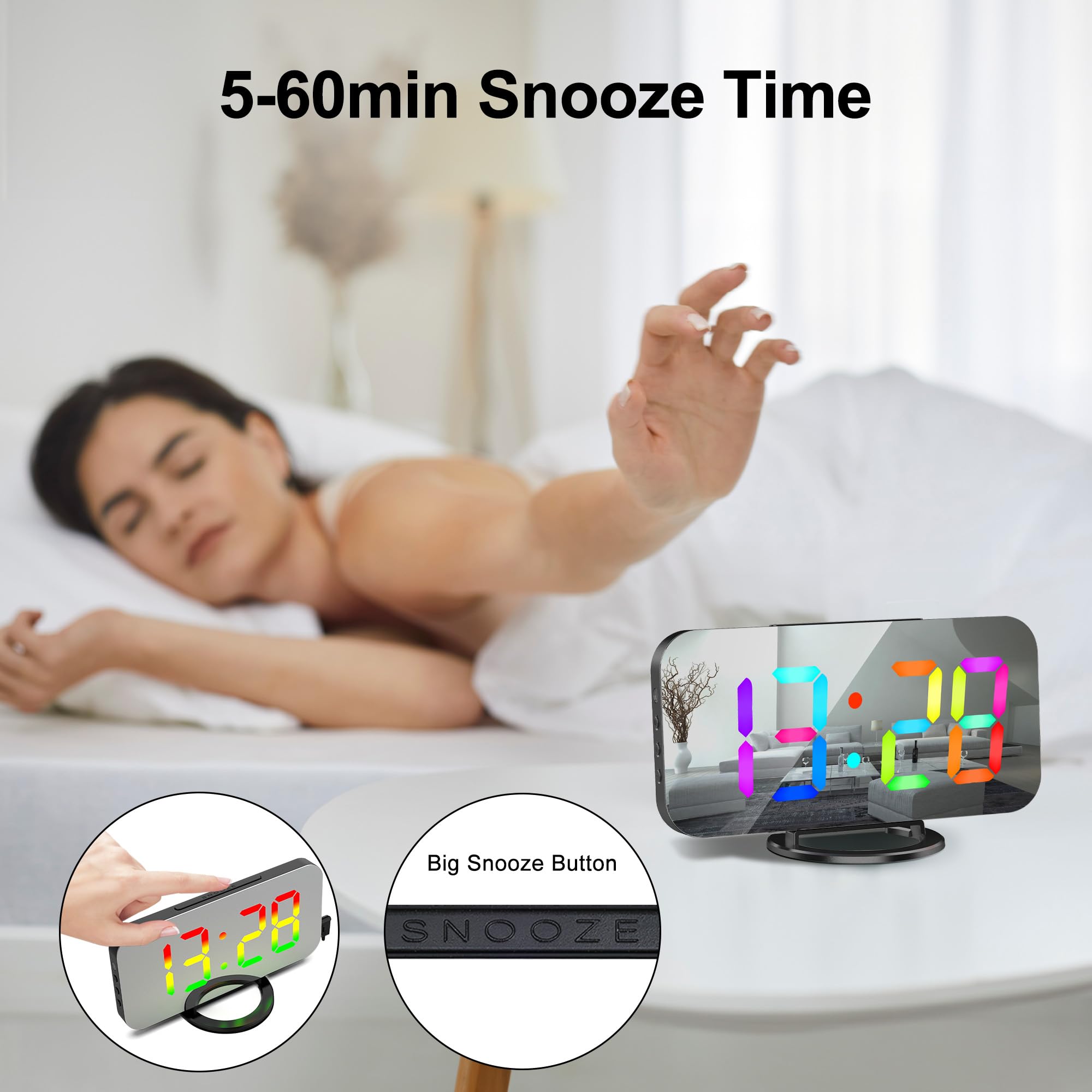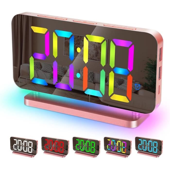 VBESTLIFE Horloge numérique Réveil LED Affichage numérique Miroir de Avec le capteur de lumière, l’écran peut ajuster automatiquement la luminosité lorsque le mode de gradation automatique est activé, ce qui fait que la lumière de l’affichage LED ne perturbe pas votre sommeil la nuit. Horloge RGB Couleurs Réglables Réveil Numérique Horloge Numérique LED Horloge Digitale Réveil Reveil Projecteur Plafond L’écran miroir en acrylique est élégant et pratique comme miroir de maquillage. De plus, la luminosité des LED peut être réglée manuellement sur 2 niveaux en appuyant sur le bouton SNZ/LIGHT. [Sans Rayonnement]Avec son apparence moderne, son savoir-faire délicat et son affichage des numéros blanc, ce réveil numérique remplace votre téléphone cellulaire et vous permet de dormir loin des radiations PiKaPiKaP RGB Réveil nuérique, 9,6 Horloge urale nuérique, USB... Commencez votre journée avec un téléphone complètement chargé. Pas besoin de réinitialiser le réveil lorsque le courant est rétabli. Il convient également aux personnes âgées, enfants, ado, adulte et malvoyant. Avec une lecture cool et arc-en-ciel, cette horloge RGB vous offre une expérience de couleur différente et constitue une décoration de chambre idéale sur une table de chevet ainsi qu’un cadeau parfait pour les enfants en anniversaire et en vacances. Et il peut charger 2 autres appareils pendant que le réveil LED fonctionne. 【11 écrans RGB Colorés】Choisissez votre couleur préférée parmi plusieurs affichages de l’heure RGB.