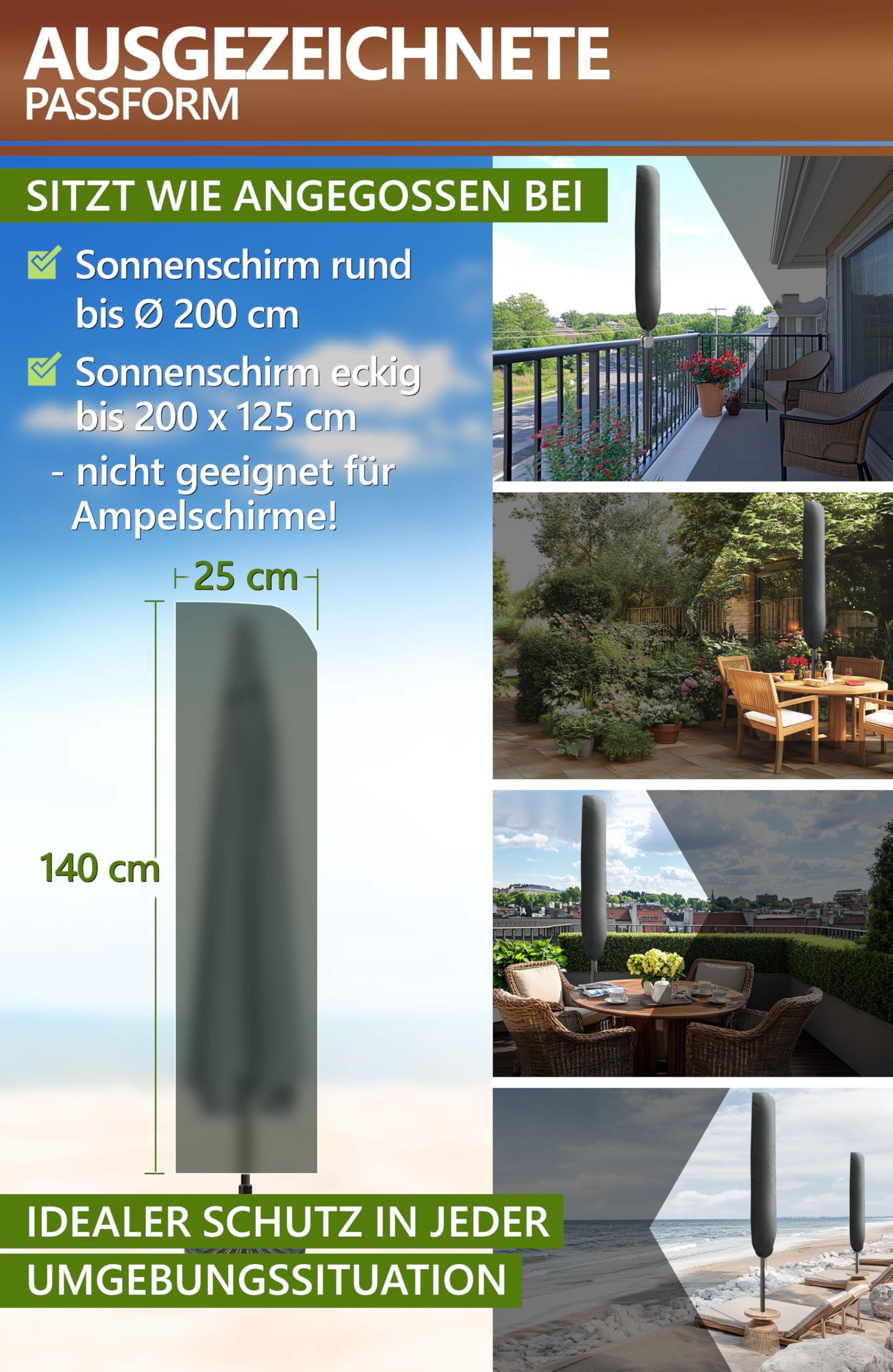 4smile - La housse de protection idéale pour parasol pour une protection durable Avec la housse de protection pour parasol résistante aux intempéries de 4smile votre parasol reste protégé de manière optimale. Avec sa construction bien pensée, la housse de parasol est imperméable et facile à utiliser. Que ce soit un parasol de balcon, un parasol rond ou un parasol petit, la housse de parasol maintient votre parasol en meilleur état. Nos housses de parasol assurent une protection toute l'année. Cette housse de parasol est également idéale pour les parasols de balcon rectangulaires ou petits. La housse de parasol universelle est idéale pour les modèles ronds jusqu'à les parasols de 200 cm et les parasols rectangulaires jusqu'au parasol rectangulaire de 200 x 150 cm. Housse Parasol Anthracite Anti-UV 4smile Housse De Protection Pour Parasol - Anthracite - Robuste - 2 M Housse Parasol 2m Diamètre Housse de parasol droit imperméable polyester anthracite ECLOZ - Gamm vert La housse de parasol de jardin s'adapte parfaitement, même en cas de vent fort. Fabriqué en 100 % polyester, la housse de protection pour parasol est particulièrement résistante, durable et imperméable. Résistant aux intempéries - Les housses pour parasols protègent le parasol des intempéries telles que le soleil, la pluie, la poussière, la neige, le gel. Les clients sont satisfaits de la fonctionnalité, de la protection et du rapport qualité-prix de cette housse pour parasol. Ils la décrivent comme parfaite, impeccable et remplissant très bien son rôle Pour une fixation sûre en cas de vent, la housse de parasol dispose d'un cordon d'ourlet de qualité supérieure qui empêche le glissement. Emballage coupe-vent : le cordon d'ourlet de qualité supérieure au bas de la housse de parasol imperméable permet une fixation sûre même en cas de vent fort Pour une protection durable et un aspect soigné de votre parasol, le parasol de qualité supérieure de 4smile est le choix idéal. Achetez 4smile Housse de protection pour parasol rond jusqu'à 200 cm, carré jusqu'à 200 x 125 cm – Housse de parasol avec barre, fermeture éclair... La housse de parasol est particulièrement résistante aux intempéries Ne convient pas aux parasols En outre, elle empêche la formation de moisissures et prolonge considérablement la durée de vie de votre parapluie.