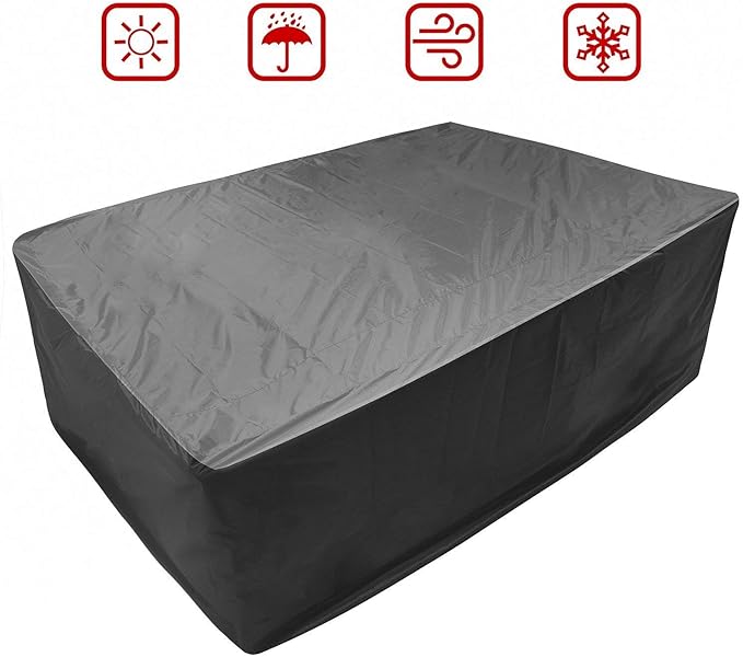 Veuillez mesurer soigneusement les dimensions de votre ensemble de meubles avant d'acheter) Housse Salon Jardin Cordon Serrage Boucles OOOXZO Housse De Protection Table De Jardin Rectangulaire 120x100x90cm Housse Table Rectangulaire 230x140x90 Cm Tissu Oxford 600D OOOXZO Housses Pour Mobilier De JardinHousse de protection pour meubles de jardin toutes saisons, bache de protection exterieur salon de jardin bache de protection housse table de jardinInformations sur le produit:►Couleur : Noir►Type: Couverture de meubles de jardinMatériel: Nylon haute densité Oxford et PVC►Caractéristique spéciale : contre le vent, anti-pluie anti-UV et réfléchit la chaleur►Contenu de l'emballage: Oxford tissu antipoussière jardin extérieur et x1 couverture imperméable►Veuillez mesurer vos meubles avant d'acheter, en particulier la profondeur des chaises si vous assemblez des chaises et une table. Housse de protection pour meubles de jardin ronds en tissu Oxford 600D... Conception sûre et coupe vent : Notre bache pour meubles de jardin est dotée de quatre boucles d'angle et d'un cordon de serrage inférieur, ce qui peut assurer une bonne stabilité même par vent fort et garder votre canapé ou vos chaises et sets de table dans le meilleur état et prêts à être utilisés à tout moment Large application : Ce produit convient pour recouvrir et protéger les tables de terrasse, les chaises, les tables rectangulaires, les meubles en rotin. WOLTU Housse de Protection Housse de Chaises de Jardin en Oxford 600D... L'intérieur est revêtu d'un PU argenté écologique qui protège vos meubles des rayons du soleil et des intempéries Aide le revêtement du meuble et les meubles à rester secsLa housse de meuble est disponible dans les tailles moyennes, grandes et très grandes, afin que vous puissiez trouver l'ajustement parfait Un simple coup de chiffon suffit pour les nettoyer, et elles sèchent rapidement au soleil. Vert Housse Salon de Jardin 420D Oxford Tissu Housse de Protection pour Parfaites pour vos meubles en rotin, tables et chaises de jardin, ces housses maintiennent vos meubles en excellent état toute l'année (la couverture dépend de la taille du mobilier d'extérieur, en particulier de la profondeur des chaises.
