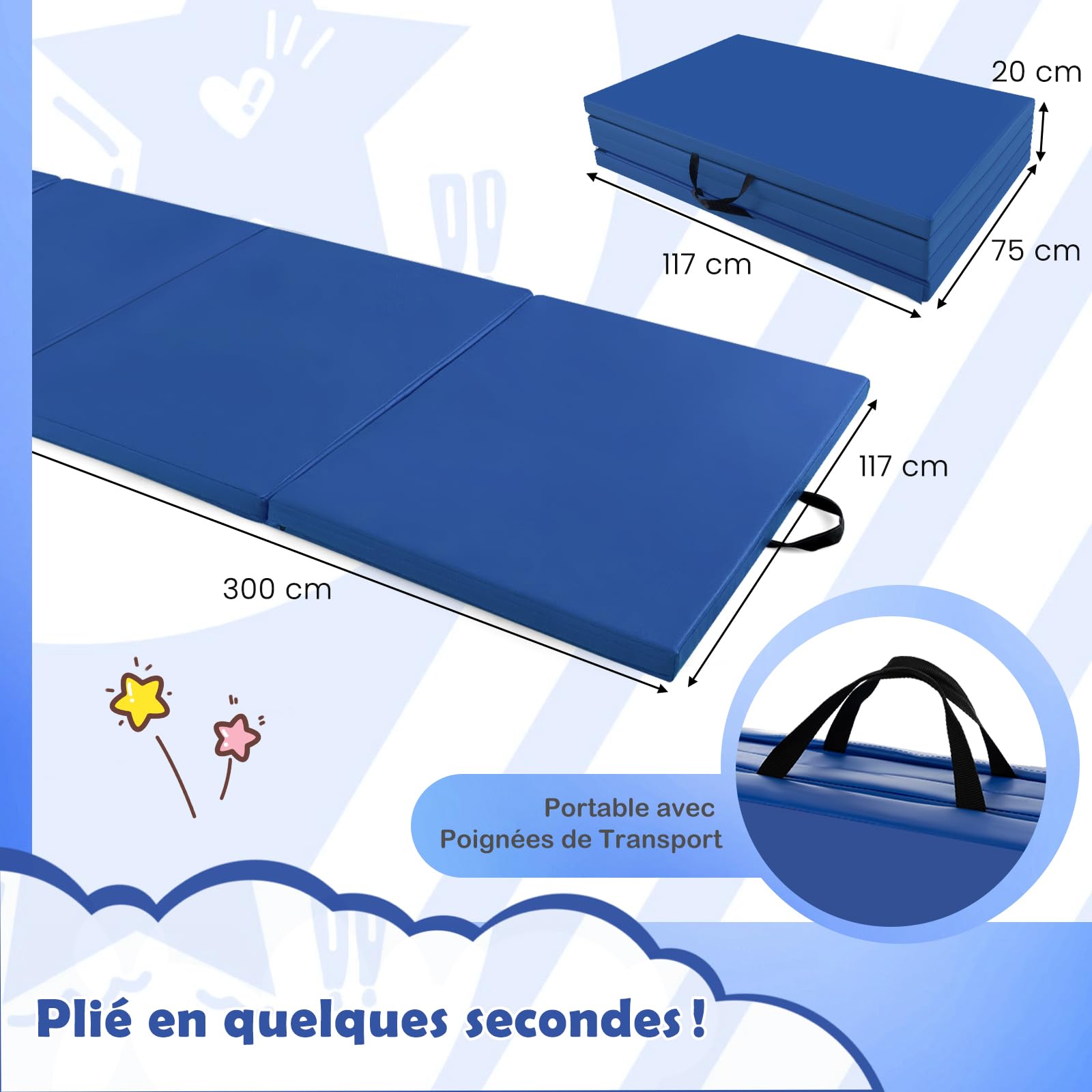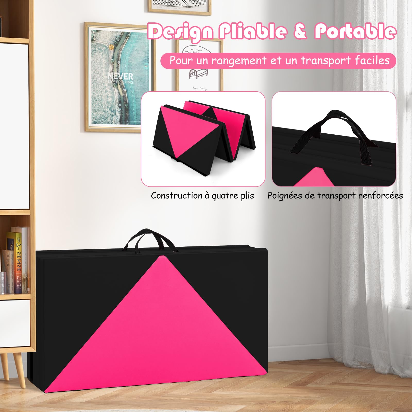 Traits Dominants Peut être plié dans une taille compacte Facile à transporter grâce aux poignées intégrées Rempli de mousse EPE épaisse et de haute densité pour protéger les articulations Recouvert de similicuir résistant à la déchirure et à l'abrasion Housse à fermeture éclair permet de l'enlever et de la nettoyer facilement Disponible pour relier plus de tapis avec des fermetures auto-agrippantes Idéal pour le fitness, la gymnastique, le yoga et plus encore Infos Détaillées Couleur : Violet Matériau : Mousse EPE Dimensions Globales : 240 cm x 116 cm x 5 cm (L x l x H) Dimensions Pliées : 116 cm x 60 cm x 20 cm (L x l x épaisseur) Poids Net : 4,5 kg Le Colis Comprend 1 x Tapis de Gymnastique Pliable # 𝐍𝐞𝐭𝐭𝐨𝐲𝐚𝐠𝐞 𝐅𝐚𝐜𝐢𝐥𝐞 # Ce tapis est équipé d'une couverture en cuir artificiel imperméable qui se nettoie d'un simple coup de chiffon. # 𝐃𝐞𝐬𝐢𝐠𝐧 𝐌𝐮𝐥𝐭𝐢𝐟𝐨𝐧𝐜𝐭𝐢𝐨𝐧𝐞𝐥 # Grâce aux fixations auto-agrippantes situées sur tous ses côtés, notre tapis offre la possibilité d'être joint à d'autres pour créer une surface d'exercice plus grande et stable. Doté d'une bande auto-agrippantes permettant de le fixer facilement à d'autres tapis, ce tapis polyvalent est idéal pour une grande variété de sports. Tapis de fitness pliable 240x116x5cm Noir : Chez # 𝐂𝐨𝐧𝐟𝐨𝐫𝐭 𝐞𝐭 𝐏𝐫𝐨𝐭𝐞𝐜𝐭𝐢𝐨𝐧 # Immergez-vous dans vos activités grâce à notre tapis de gymnastique ultra-confortable pourvu d'un rembourrage en mousse EPE. Il est doté d'une mousse EPE haute densité qui absorbe les chocs et prévient les tensions articulaires et les blessures. Tapis de Course Pliable Silencieux GYMAX avec 2 Ecrans LED, Application... Il constitue une partie essentielle de votre équipement de fitness, apportant sécurité et confort où que vous soyez, et s'intégrant parfaitement dans tout espace d'activité ou de jeu. À Propos de l'Article Vous êtes toujours à la recherche d'un tapis adapté à votre activité physique ? Ce tapis de fitness pliable optimise le confort et la sécurité pendant votre entraînement. Pour un nettoyage en profondeur, la housse zippée se détache facilement, vous permettant de maintenir votre tapis en excellent état sans effort. Mousse EPE Haute Densité GYMAX Tapis De Gymnastique Épais Pliable 180x60x5cm, Combinaisonable Avec Attache Auto-Agrippante, Housse En Simili Cuir, Portable Avec Poignées De Transport, Pour Yoga, Fitness, Étirement(Rose Chaud Tapis Yoga Mousse EPE Antidérapant La surface résistante à la transpiration réduit les risques de glissement lors de l’exercice, et le toucher doux pour la peau apporte plus de confort. # 𝐑𝐞𝐦𝐛𝐨𝐮𝐫𝐫𝐚𝐠𝐞 𝐃𝐨𝐮𝐱 𝐞𝐧 𝐄𝐏𝐄 # Ce tapis d’exercice est conçu avec un rembourrage doux en mousse EPE à haute densité # 𝐋𝐚𝐫𝐠𝐞 𝐀𝐩𝐩𝐥𝐢𝐜𝐚𝐭𝐢𝐨𝐧 # Notre tapis d'exercice est parfait pour une variété d'usages, que ce soit pour la gymnastique, le yoga ou des jeux pour enfants.