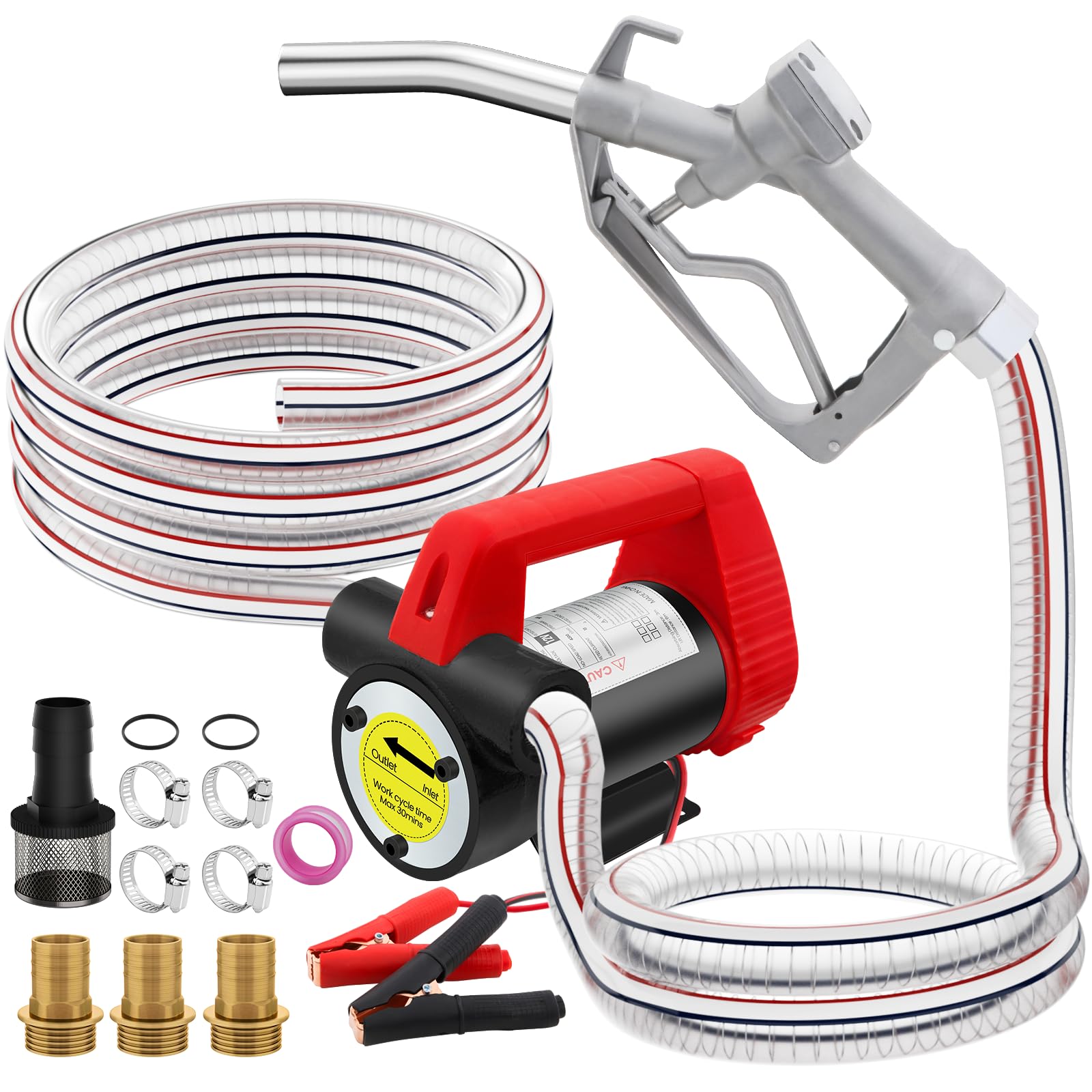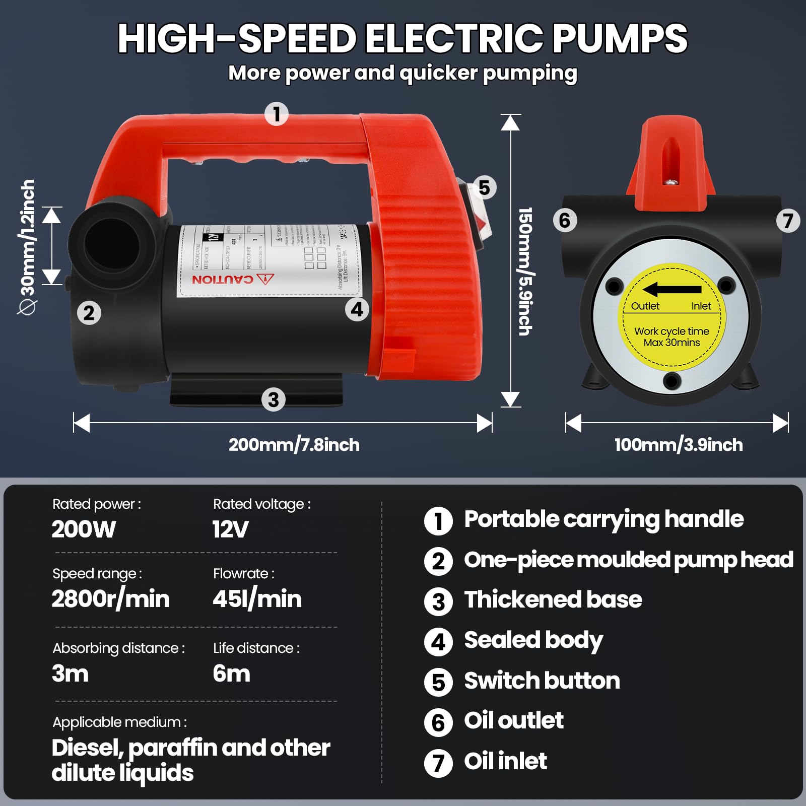 Pompe à gasoil Pompe à fioul Pompe à diesel 12V 56 l/min 110/200W 2 adaptateurs 4062859145215 Cette pompe de transfert gasoil ou fuel est un outil très utilisé dans le domaines de l’agriculture ou des garages automobiles. L’alimentation 12 V permet ainsi de ravitailler un engin ou un véhicule en carburant loin de toutes sources de courant habituel, cela en la branchant directement sur la batterie 12 V du véhicule ravitailleur Pompe Diesel Agricole Réservoir 12V Portable Carburant Diesel Pompe Huile Transfert Pompe à Auto-amorçage Mis 45L/Min 200W Pompe Gasoil La vitesse de ce puissant moteur peut être de 2800 r/min, ce qui permet une efficacité élevée et des économies d'énergie. Nous intégrons des tuyaux d'entrée et de sortie d'huile, une pompe à huile et une buse dans un seul corps, réalisant un ensemble de pompe de transfert gazole de petite taille pour vous. Flyelf 12V DC Pompe à Carburant Portable Auto-amorçant... 【Conception monobloc】- Dans cette pompe à huile électrique, vous pouvez voir cette conception tout-en-un. 【Précis et contrôlable】- Pompe à gazon électrique est équipée d'une buse auto-obturante avec un débit allant jusqu'à 16 GPM. 【Large application】- Cette excellente pompe de transfert diesel électrique auto-amorçante convient aux équipements agricoles, aux équipements d'ingénierie, aux réservoirs de stockage de diesel, etc. Ne l'utilisez pas pour l'essence, l'huile de machine ou d'autres liquides.