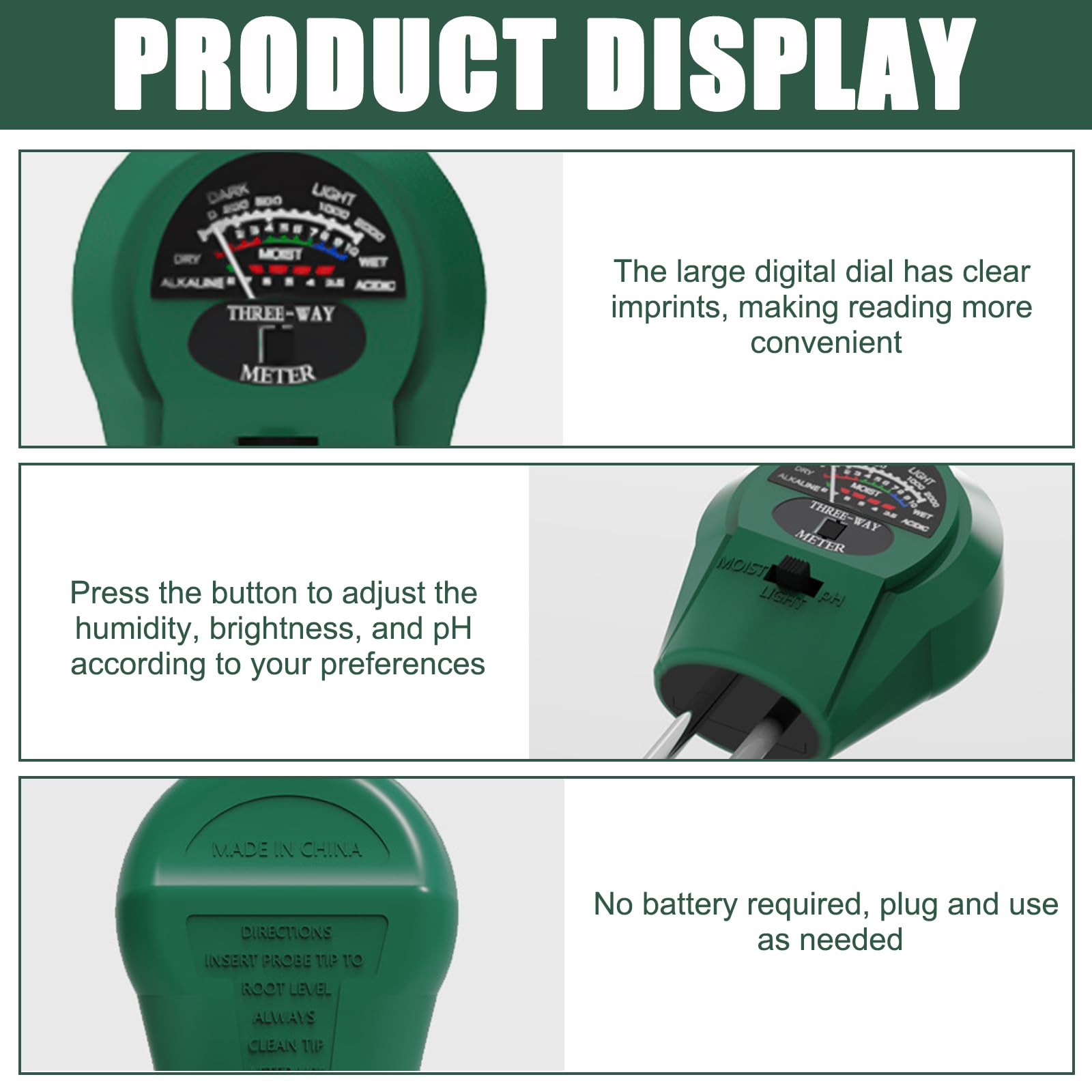 Notre testeur de pH du sol 3 en 1 est également idéal pour le jardinage domestique, les professionnels ou les amateurs de jardinage. Humidimètre Plantes Sans Piles Humidimètre Pour Plantes 6 En 1 Avec Fertilité Du Sol/humidité/pH/température/ensoleillement Testeur Sol Sans Piles Large gamme d'applications : Nous croyons fermement que le testeur d'humidité du sol doit être le choix parfait pour vous. En surveillant de près l'humidité du sol avec votre testeur d'humidité pour plantes, vous contribuez à créer un environnement idéal pour favoriser la croissance et la floraison de vos plantes Les dimensions de notre humidimètre pour sol sont de 24,5 cm x 6 cm. Sonde à double aiguille hautement sensible - L'humidimètre est équipé d'une sonde à double aiguille hautement sensible qui améliore la vitesse et la précision de la détection et de l'analyse de l'humidité du sol, garantissant des mesures précises dans une plage d'humidité de 1 à 10 (sec à humide), une intensité lumineuse de 0 à 2000 (peu à beaucoup de lumière) et un pH de 8 à 3,5 (alcalin à acide), ce qui permet de sélectionner plus précisément un environnement de croissance adapté aux plantes. Humidimètre du sol - DUOKON - Compteur d'eau pour plantes - Mesure l'humidité, la fertilité et... Dimensions : 255 x 60 x 35 mm. Nos humidificateurs de sol pour plantes sont parfaits pour le jardin, les professionnels ou les amateurs de jardinage et sont l'outil idéal pour les jardins, les fermes et les pelouses pour les plantes en pot, les jardins, les pelouses, etc. La plage de couleurs indiquée par l'aiguille sur l'écran vous permet de facilement évaluer l'état de croissance de la plante et de lui prodiguer les meilleurs soins. Capteur Lumière Plantes Testeur Sol 3 En 1 GAOUTO - Lot De 4 - Mesure Humidité, PH Et Lumière - Pour Jardinage Et Plantes Humidimètre Jardin PH Lumière Spécificités : Nom du produit : humidificateur de sol pour plantes Couleur : vert. L'humidimètre fournit une multitude de données pour vous donner des informations complètes sur l'état du sol.