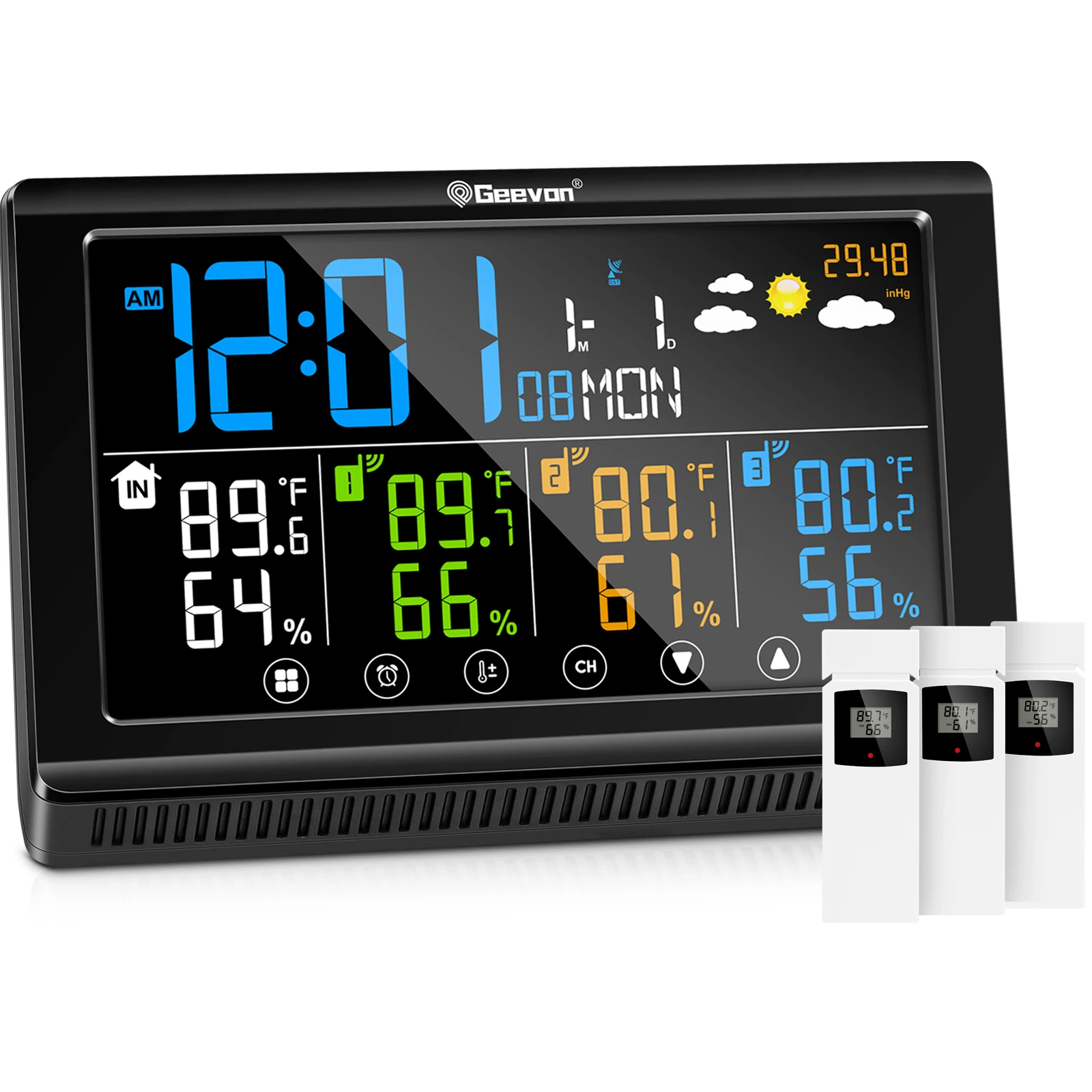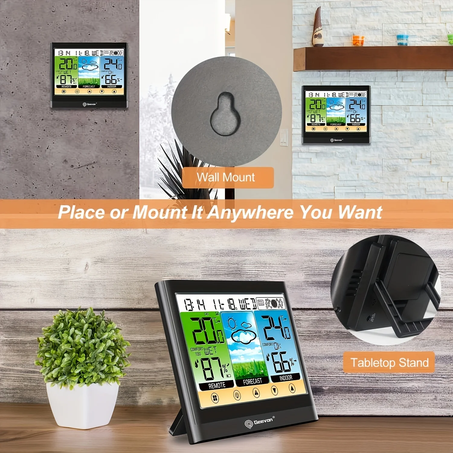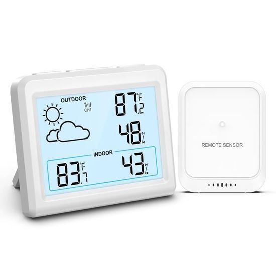 Station Meteo Amazon Station Météo Sans Fil,Thermomètre Hygromètre Numérique Intérieur Et Extérieur Avec Capteur Station Meteo Avec Capteur Extérieur Station Météo Geevon Sans Fil - Capteur Extérieur Inclus Geevon Station étéo sans fil pour intérieur et extérieur, grand écran... Prévisions météo : le thermomètre avec hygromètre prédit les conditions météorologiques pour les 12 à 24 heures suivantes en fonction de l'humidité et de la température détectées par les capteurs, avec une précision d'environ 40 à 45 %. Paramètres du produit : ce thermomètre numérique prend en charge le fonctionnement sur batterie (3 × 1,5 V AAA, non inclus) ou le fonctionnement en courant continu (entrée 5,0 V 1 A). Plage de température intérieure : -9,9 ℃ ~ +50 ℃ (+14,0 ℉ ~ +122 ℉) ; plage de température extérieure : -40 ℃ ~ 60 ℃ (-40 ℉ ~ +140 ℉) ; plage d'humidité : 20 % RH ~ 95 % RH Appuyez brièvement sur le bouton MEM pour demander la valeur de température et d'humidité max/min, la valeur max/min et la valeur actuelle UTILISATION MULTIPLE : cet hygromètre intérieur et extérieur peut être utilisé comme thermomètre d'intérieur à l'intérieur, température et humidité, thermomètre extérieur résistant aux intempéries, thermomètre avec hygromètre, station thermomètre extérieur et intérieur, hygromètre de l'air ambiant, thermomètre numérique intérieur et extérieur, hygromètre appartement Rétroéclairage / fonction sensible à la lumière : lorsque la station météo sans fil avec capteur extérieur fonctionne sur piles, le rétroéclairage peut être activé pendant 10 secondes en appuyant sur Auto Light. En fonctionnement à courant continu, le rétroéclairage est toujours allumé par défaut et peut être commuté en appuyant brièvement sur AUTO LIGHT à clair/obscurité, et le mode photosensible peut être activé et désactivé en appuyant longuement pendant plus de 3 secondes La station météo sans fil intérieur/extérieur indique la météo pour les prochaines 12 heures sur la base de la tendance de la pression atmosphérique et l'affiche avec 6 symboles significatifs