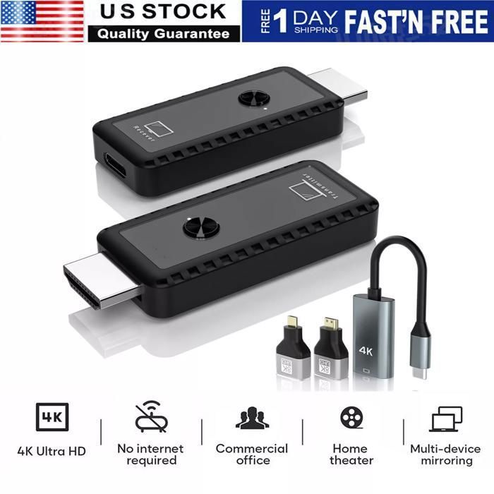 Large compatibilité : l'émetteur sans fil prend en charge la projection de PC/ordinateur portable/caméras/DV/TV box vers projecteur/moniteur/TV HDTV. L'Émetteur et Récepteur HDMI sans Fil offre une solution pratique pour le streaming audio et vidéo depuis un PC ou un ordinateur portable vers un téléviseur HD... Affichage du signal LED et conseils d'utilisation : il y a un affichage numérique sur l'émetteur HDMI sans fil pour afficher la force du signal. Il n'y a presque pas de retard et vous le remarquerez à peine., (<0., 01s) Diffusez des vidéos en douceur. Transmission Sans Fil 1080p ICZI Émetteur Et Récepteur Hdmi Sans Fil,décodage 4K 1080P, Extension Double Bande 2,4G 5G Compact Un clic pour déconnecter et un clic pour se connecter, facile à changer du mode copie et du mode étendu, facile à utiliser. émetteur et récepteur hdmi sans fil Boîtier en métal et taille compacte : par rapport à d'autres émetteurs HDMI en plastique, le TTQ TR60 applique un boîtier en métal, plus durable et exquis. Vous pouvez connaître l'état de la connexion en temps réel. (Si la connexion n'est pas stable, la raison la plus probable est le manque de tension. L'émetteur HDMI sans fil peut décoder des vidéos jusqu'à 4K et produire des vidéos en qualité d'image 1080p et un taux de fraîcheur élevé de 60 Hz. (La distance et la vitesse de transmission peuvent être affectées si elle rencontre un blocage) HD 1080P/60Hz]L'émetteur et le récepteur sans fil HDMI peuvent connecter/déconnecter des appareils facilement, prend en charge la sortie Ultra HD 1080P/60Hz... Plug and Play, facile à connecter en 10 secondes. ) Contenu : 1 émetteur HDMI sans fil, 1 récepteur sans fil, 1 manuel de l'utilisateur (français non garanti), 2 convertisseurs HDMI, 2 câbles de charge de type C, câble d'extension HDMI. HDMI sans Fil, Émetteur et Récepteur HDMI sans Fil, 98FT/30M Kit d