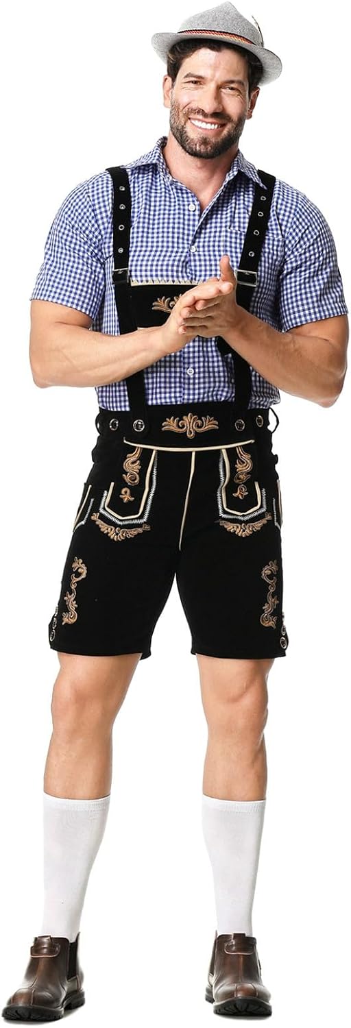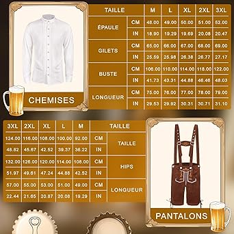 Déguisement Oktoberfest Complète : Ce déguisement homme Oktoberfest contient tout ce qu’il vous faut pour une tenue réussie : chemise à carreaux, pantalon à bretelles style bavarois, chapeau alpin en feutre avec plume et chaussettes hautes blanches. Les Gens Dans Le Costume Allemand Avec L'illustration Plate De Tasses... Sa coupe bien pensée et sa finition soignée en font un choix idéal pour les amateurs de style festif Avec notre ensemble de costume pour l'Oktoberfest, vous serez parfaitement préparé pour vous immerger dans l'excitation de la fête. Tenue Oktoberfest Homme IEEILULU Déguisement Oktoberfest Homme, Costume Allemand Oktoberfest Homme Avec Porte-bavoir Amovible, Chemises à Carreaux, Chaussettes Pour Les Genoux Et Chapeaux De Feutre Bavarois (Bleu, M Déguisement Bavarois Complet Matériaux Confortables : Fabriqué à partir de tissus doux et durables, ce costume Oktoberfest homme offre un confort optimal – même après plusieurs heures de fête. Description du produit IEEILULU Déguisement Oktoberfest Homme, Costume Allemand Bavarois Oktoberfest Homme avec Porte-bavoir Amovible, Chemises à Carreaux, Chaussettes pour Les Genoux et Chapeaux de Feutre Bavarois Vous recherchez des vêtements idéaux pour l'Oktoberfest? Notre Costume Oktoberfest homme a un design classique qui reflète parfaitement le style bavarois traditionnel. Plus besoin de chercher les éléments un par un – vous êtes prêt pour l’Oktoberfest, une soirée à thème ou un festival de la bière Léger, bien structuré et agréable à porter, il vous garantit un look inoubliable sur chaque photo de fête Une Expérience Oktoberfest Inoubliable : Que ce soit pour danser, trinquer ou chanter, cette complète déguisement homme Oktoberfest est votre alliée idéale pour célébrer. La hauteur mi-mollet ajoute une touche d'authenticité à votre tenue et se marie parfaitement avec le pantalon. Que vous dansiez sur une musique animée, que vous dégustiez de délicieuses spécialités bavaroises ou que vous leviez une chope de bière en célébration, cet ensemble capture l'essence de l'Oktoberfest et garantit une expérience inoubliable. Portrait de l'homme de l'Oktoberfest, portant les vêtements... Notre ensemble de costume Oktoberfest comprend également un chapeau traditionnel bavarois pour apporter la touche finale à votre tenue d'Oktoberfest. Idéale pour l’Oktoberfest, un enterrement de vie de garçon, une soirée déguisée ou un événement à thème, elle incarne l’esprit bavarois et promet des souvenirs inoubliables Déguisement pour homme Allemand - Costume fete de la biere pas cher