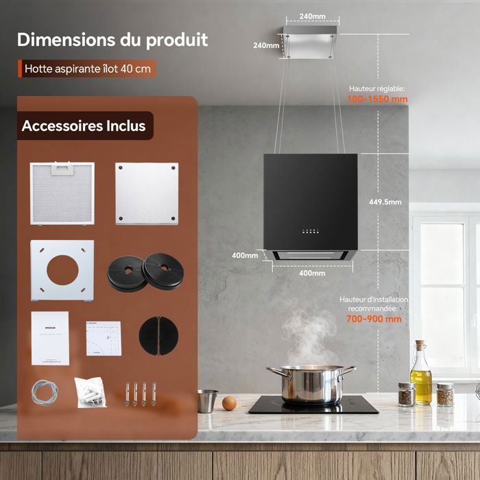 Son design noir élégant et sa suspension réglable (45-200 cm) s'adaptent à tous les espaces. La hotte sans evacuation recycle l'air grâce à 2 filtres à charbon (réf., YYCF-120E). Filtre pratique en aluminium Le fonctionnement silencieux préserve le confort de cuisson. Installation Simplifiée & Accessoires: La hotte aspirante comprend : filtre aluminium 5 couches, 2 filtres à charbon actif, kit de fixation et notice multilingue. Pratique & Commodité: La Hotte de cuisine silencieuse dispose d'un arrêt retardé de 5 minutes pour l'élimination des vapeurs résiduelles. Idéale pour les cuisines sans conduit extérieur - fonctionne en totale recirculation sans perte de performance. Filtre en aluminium à 5 couches amovible, filtre efficacement les graisses et les vapeurs., Passe au lave-vaisselle. Découvrez la sélection Hotte ilot pas cher de et sa large gamme de modèles. Qualité et Confort au meilleur prix. Retrait magasin et Livraison Le nettoyage facile de la surface et du filtre aluminium lavable complète ses fonctionnalités pratiques. Économie d'Énergie: Le moteur DC sans balais (120W) classe A+ offre une excellente efficacité énergétique. SNODAS Hotte de cuisine îlot noire pour une cuisson détendue Hotte îlot centrale avec éclairage - Mood Avec son débit de 800 m³/h, elle élimine efficacement odeurs et graisses tout en apportant une élégance esthétique à votre îlot de cuisine. Visibilité améliorée pour une zone de cuisson plus lumineuse et plus claire. La hotte d'îlot avec filtre à charbon actif YYCF-WH01 filtre efficacement les vapeurs de cuisson et renvoie l'air purifié dans la pièce. Cette hotte de cuisine réduit la consommation électrique. Elégant & Compact: La hotte ilot central SNDOAS de 40cm s'intègre parfaitement dans les cuisines modernes. SNDOAS Hotte Ilot Central, 800m³/h, Hotte Aspirante 40cm avec 2 Filtres à Charbon, 3 Vitesses Fonction Boost, Arrêt Retardé (5 minutes), Éclairage LED, Noire... Hotte Sans Evacuation SNDOAS Hotte Ilot Central, 800m³/h, Hotte Aspirante 40cm Avec 2 Hotte Aspirante îlot Centrale 40cm 1 3 vitesses + Boost 2 Fonction silencieuse 3 Arrêt différé L'éclairage LED (2x3W) éclaire parfaitement la zone de cuisson. La hotte de cuisine îlot est réglable en hauteur pour s'adapter individuellement aux conditions de la pièce.