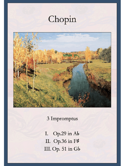Includes Impromptu in A-flat Major, Op. 29; Impromptu in F-sharp Major, Op. 36; and Impromptu in G-flat Major, Op. 51. The central section of each... Includes Impromptu in A-flat Major, Op. 29; Impromptu in F-sharp Major, Op. 36; and Impromptu in G-flat Major, Op. 51. The central section of each is characterized by the cessation of movement and effusive lyricism Impromptu Op 29 In A Flat Major For Piano Classical Masterpieces - Frédéric Chopin: Impromptus Nos. 1-3 & Polonnais Nos. 1
