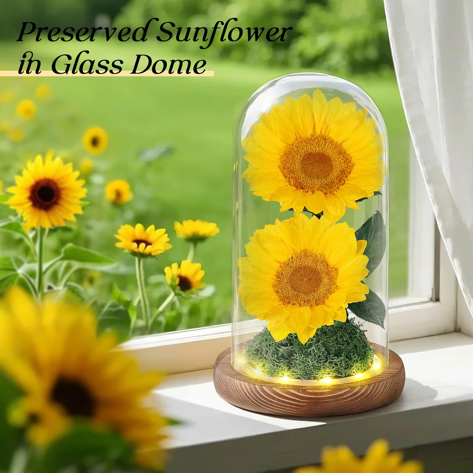 Décoration Maison LED Bois MAMAMIKO Forever Real Rose In A Glass Dome,Eternal Red Roses Flowers Preserved For 5 Years,Rose Gifts For Her Woman Wife Girlfriend On Birthday, Anniversary, Valentine's Day, Mother's Day, Christmas LED Intégrée Cadeau Romantique RANGEMENT - CASIER - ETAGERE Préservé Rose Couverture De Verre Chapeau Cloche Tournesols Sur Planche En Bois Imprimé Réfléchissant Rayé Chapeau De Pêcheur... Le coffret comprend une carte de vœux et est présenté dans une luxueuse boîte cadeau en soie, prêt à offrir sans préparation supplémentaire. Un Cadeau Attentionné pour Toutes les Occasions :Que ce soit pour la Saint-Valentin, un anniversaire, un anniversaire de mariage, la fête des mères, une remise de diplôme ou Noël, ces tournesols éternels sont une manière intemporelle de montrer votre amour et votre reconnaissance. Conçus pour toucher les épouses, petites amies, mamans, grands-mères, amies et toutes les femmes spéciales de votre vie. Beauté Intemporelle avec Conservation Avancée :Grâce à une technologie de conservation japonaise avancée, ces vrais tournesols sont parfaitement protégés dans une cloche en verre cristallin. Décoration d’Intérieur Élégante: Intégrée avec des lumières LED douces (3 piles AAA non incluses), la base en bois de cette composition florale préservée illumine doucement les fleurs la nuit. Elle crée une atmosphère chaleureuse et accueillante — parfaite pour sublimer le charme de votre salon, chambre ou décoration de bureau. Charme Durable, Sans Entretien :Conservés sous une cloche hermétique qui protège de la poussière et de l’humidité, ces tournesols restent éclatants année après année. Découvrez notre collection de roses éternelles sous cloches, des cadeaux d'exception... Chez , toutes les fleurs sont délicatement parfumées... une véritable expérience olfactive