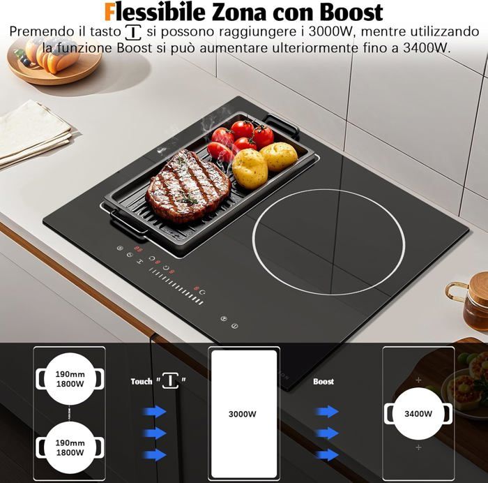 Karinear Plaque Induction Flexizone avec Hotte Aspirante, Table de Cuisson Induction 4 Foyers avec Booster, Timer, Pause, Plaque Electrique 4 Feux 7200W et Hotte Aspirante 145 W, 220-240V, sans prise Plaque à Induction 4 Foyers avec Prise, Karinear Plaque Induction 4... Plaque Induction Encastrable Flexizone Plaque à Induction, Plaque De Cuisson à Induction Electrique - (8600W, Autarkic, 5 Foyers, 90cm, Encastrable, Intégré, Tactile, Minuteur, Verre-céramique)- 5 Zone New Plaque électrique 5 Foyers Pause 🍲 【Cuisson multifonctionnelle】Cette Plaque Induction 5 Feux est équipée de foyers de tailles variées, vous permettant de cuisiner simultanément plusieurs plats pour toute la famille. 🔥 【Mode Boost ultra rapide】Avec la fonction Boost, chaque foyer peut atteindre sa puissance maximale pendant 5 minutes pour un chauffage express, idéal pour bouillir de l’eau ou saisir les aliments rapidement sur votre Plaque Induction. Plaque à Induction 4 Foyers avec Fiche, Karinear Plaque Induction 4... Idéale pour répondre à tous vos besoins culinaires en une seule Table de cuisson. 🔒 【Sécurité enfants renforcée】La fonction de verrouillage enfant empêche toute activation involontaire de la Plaque électrique. Cette Plaque Induction 5 Foyers vous offre une grande liberté et précision dans vos préparations. Idéale pour les foyers avec enfants, elle garantit sécurité et tranquillité d’esprit pendant la cuisson.