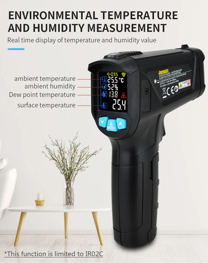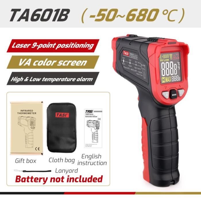 Description du produit Thermomètre infrarouge, pistolet numérique de température des aliments pour la cuisson, thermomètre à pistolet à température chaude portatif sans Laser IR 50600 ? Spécification : MATÉRIAU DE HAUTE QUALITÉ : Le pistolet de température laser numérique sans est fabriqué en matériau ABS, résistant aux chocs, aux rayures et Longueur d'onde de réponse : 8-14 μm , Émissivité : 0,95 standard Temps de réponse : 500 ms, 95 % de réponse PAS POUR LES HUMAINS : ce thermomètre infrarouge numérique ne convient PAS pour mesurer la température corporelle dans humains. LARGE APPLICATION : Ce thermomètre infrarouge peut être utilisé pour mesurer la température de surface des composants suivants, tels que B. Mesure Température Surface VEVOR Double Laser 50:1 Pistolet De Température Thermomètre Infrarouge Thermometre pluviometre Thermomètre Infrarouge Digital Pistolet Température de stockage : -20 °C ~60 ℃(-4~140℉), Liste des paquets : Type d'élément : Thermomètre infrarouge, Matériau : ABS INFORMATIONS SUR LE PRODUIT : La plage de température de ce thermomètre infrarouge est de -50 ~ 600 ℃ (-58 ℉ ~ 1112 ℉), le temps de réponse est de 500 mSec, 95 % de réponse, la longueur d'onde de réponse est de 8 à 14 um. VBESTLIFE Thermomètre sans contact Thermomètre infrarouge numérique... Humidité relative : 10-90 % d'humidité relative, sans condensation AVEC RÉTROÉCLAIRAGE ET STOCKAGE DE DONNÉES : Après avoir sélectionné l'interrupteur de rétroéclairage, l'alimentation électrique d'un thermomètre industriel s'éteindra automatiquement dans les 7 secondes sans aucune opération. Il est conçu pour les réparations domiciliaires, la cuisine, le chauffage, la ventilation, la climatisation, l'automobile et d'autres travaux de rénovation domiciliaire. Eosnow Thermomètre infrarouge pour la cuisson, laser sans contact... UTILISATION LARGE : Ce thermomètre infrarouge peut être utilisé pour mesurer la température de des composants suivants, tels que les conduites d'eau chaude, les composants de moteur thermique, les surfaces de cuisson, les caloducs et les couches d'isolation, les connexions électriques, les ballasts de lampes, etc. MATÉRIAU DE HAUTE QUALITÉ: Le pistolet de température numérique sans utilise un matériau ABS, possède une résistance aux chocs, une résistance aux rayures, Température ambiante : 0-50°C (32-122°F)