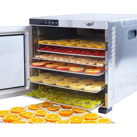 Déshydrateur Température Réglable YASHE - 5 Plateaux Inox, 400W, Minuterie 48h, Pour Fruits, Viande, Herbes Sterilisateur Electrique Bocaux Déshydrateur Alimentaire fermer Pomme de face déshydrateur lidl silvercrest Mutiler de base montant Déshydrateur d'aliments - NEBULA - 6 plateaux - Acier inoxydable... Contrôle Précis du Séchage:Réglez la température de 35 à 70 °C et la minuterie de 1 à 48 h. Que ce soit pour un déshydrateur pour herbes, tranches de fruits ou viande séchée, les réglages précis offrent un séchage adapté à chaque aliment Séchage Uniforme à 360°:Grâce à un moteur de 400 W et une circulation d’air horizontale à 360°, ce deshydrateur alimentaire inox assure une chaleur constante sur tous les plateaux. Parfait pour fruits, légumes, viande ou friandises maison Pas besoin de les retourner. Ce déshydrateur pour fruits et légumes dispose d’un rangement intégré pour le cordon et d’un format compact idéal pour votre cuisine Silencieux Avec Arrêt Automatique:Ce déshydrateur silencieux fonctionne discrètement, même la nuit. YASHE Déshydrateur Alientaire, Séchoir à Alients en Inox à 5 Plateaux...