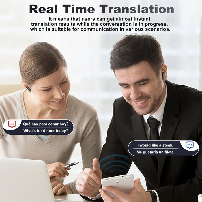 - L'écran tactile bascule entre les modes appel, traduction de texte et transcription vocale en un seul clic. Que ce soit en réunion, en exploration ou pour une assistance personnelle, notre oreillette traduction instantanée vous offre une expérience d'utilisation flexible et confortable, à tout moment et en tout lieu 【Design Tactile Multifonction】Ce ecouteur traducteur instantané offre des modes intelligents tels que la conversation libre, la traduction d'images et la transcription vocale. Traducteur IA Conversation Afenau Ecouteur Traducteur Instantané, 144 Langues Oreillette écouteur Traducteur Charge rapide via l'interface Type-C. - Portée d'appel ultra-longue, jusqu'à 10 mètres, compatible avec les appareils iOS/Android, idéal pour les réunions internationales, les voyages, les études, le bureau et autres situations, vous permettant de surmonter les barrières linguistiques et de communiquer plus librement. Capacité de traduction multilingue puissante]: Nos écouteur traducteur temps réel sans fil sont une puissance linguistique capable de traduire jusqu'à 144 langues et dialectes différents en temps réel avec un taux de précision étonnant de 97%. Que vous voyagiez à l'étranger, que vous meniez des affaires internationales ou que vous communiquiez avec des amis du monde entier, cet... Le câble de charge rapide Type-C assure une capacité de charge suffisante, que ce soit en mode traduction ou en écoute de musique Vous ne ressentirez donc aucune gêne, même en cas de port prolongé. Écouteurs de traduction Ai 2025, écouteurs de traduction instantanée en Que vous travailliez, voyagiez ou étudiiez, vous surmonterez facilement les barrières linguistiques 【Traduction Multilingue en Temps Réel】Ce ecouteur traducteur instantané est équipé d'un système avancé de traitement du langage par IA, prend en charge la traduction en temps réel en 144 langues, offre une grande précision de traduction, brise les barrières linguistiques et permet de passer facilement du mode hors ligne au mode en ligne. Il garantit une qualité de traduction supérieure et un son plus clair Autonomie de 6 à 8 heures, le boîtier de charge est équipé d'un indicateur de charge LED et autonomie en veille de 20 à 30 jours. Son écran tactile vous permet de régler le volume, de changer de chanson, de démarrer l'assistant vocal et de répondre/raccrocher d'un simple geste.