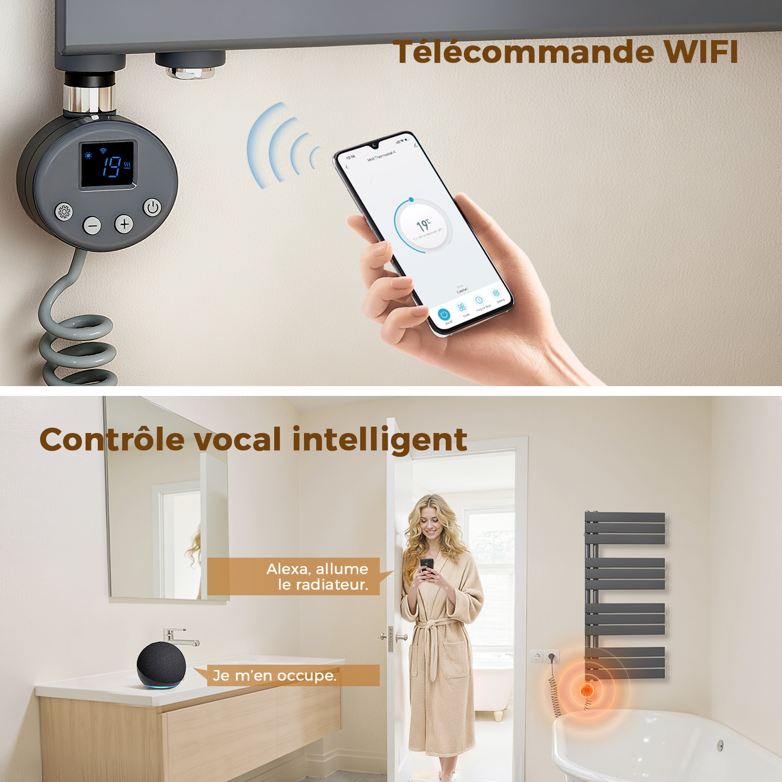 À l’aide de la dernière technologie intelligente, vous pouvez allumer ou éteindre l’élément chauffant, régler la température, définir des horaires et utiliser différents modes de chauffage de n’importe où à l’aide d’une application mobile. PROGRAMMATION DE 7 JOURS - Optimisez votre consommation d’énergie en définissant des périodes pendant lesquelles vous avez besoin que votre sèche-serviettes/radiateur soit allumé. Remarque importante - assurez-vous de maintenir enfoncé le bouton avec 3 lignes vers le bas d’abord pour connecter le radiateur avant d’appuyer sur le bouton marche. Comment se connecter Vidéo de marchand Assurez-vous que l’élément a une puissance appropriée pour la taille de votre sèche-serviettes/radiateur., Filetage standard 1/2 bsp. UTILISATION – Pour une utilisation sur les porte-serviettes et les radiateurs. Thermostat WiFi 300W Élément Chauffant Intelligent électrique Wifi Greened House Thermostat Connecté Chaudiere Gaz Greened House Porte-serviettes électrique chromé 600 W x 800 H incurvé TECHNOLOGIE INTELLIGENTE - Contrôlez votre chauffage depuis votre smartphone avec une application téléchargeable gratuitement disponible sur les systèmes d’exploitation iOS, Android et Google. Introduction à l’élément WiFi Vidéo de marchand Indice IP : IPX4 - utilisation sûre dans les salles de bains et les espaces humides. Thermostat intelligent pour plancher chauffant | Wi-Fi – Sinopé... Puis-je utiliser l’application avec mon service mobile 4G/5G ? Oui, vous pouvez utiliser l’application de n’importe où avec une connexion Internet. Longueur de l’élément - 310 mm. INFORMATIONS TECHNIQUES - 300w - Spécification de l’alimentation : 220-240V / 50-60HZ, Plage de température du chauffage : 30-70ºC. Greened House Élément chauffant électrique intelligent Wifi pour sèche-serviettes et radiateurs avec écran tactile LED Thermostat/minuterie Économe en énergie (UE) (Noir, 300w) : : Cuisine et MaisonDescription du produit Élément chauffant contrôlé par WiFi - Contrôlez votre chauffage depuis votre smartphone avec une application téléchargeable gratuitement disponible sur... Convient pour une utilisation dans les zones 2 et 3., Câble d’alimentation - 110 mm, filetage standard 1/2 bsp. GARANTIE – Garantie de 2 ans couvrant les défauts de fabrication. Comment s’appelle l’application ? Tuya Smart App – disponible sur les systèmes d’exploitation iOS, Google Android.
