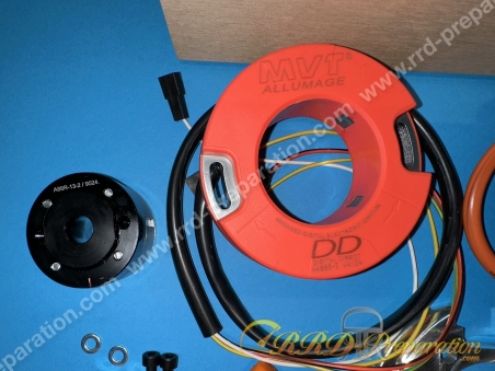 Allumage 42kv Allumage MVT Premium DIGITAL DIRECT DD02 Rotor Interne - Pour Peugeot 103 Avec Vilebrequin Gros Cone Pour Allumage Dorigine A Rupteur 18 4609 Stator Orange Pompe Eau électrique Allumage MVT Premium Rotor Interne avec éclairage Derbi Euro 2/3 PREM11 - Pièces Electrique sur La Bécanerie Allumage MVT rotor interne lumière Digital Direct Derbi euro3 et Euro4... Avec un stator orange et la possibilité d'utiliser la fixation d'origine de la pompe à eau ou de la roue d'entraînement du ventilateur, cet Allumage est idéal pour les moteurs qui utilisent une pompe à eau électrique plutôt que mécanique. Cela le rend particulièrement utile pour les moteurs de course et autres applications hautes performances. Faites confiance à l'Allumage Direct Digital MVT pour donner à votre Derbi Senda des performances et une fiabilité exceptionnelles. Ce système est conçu pour maximiser l'efficacité de votre moteur tout en offrant une tension d'allumage impressionnante de 42kV et un régime maximal de 22 000 tr/min. Puissant : génère une tension d'allumage de 42 kV, vitesse de rotation maximale jusqu'à 22 000 tr/min Facile à utiliser : livré avec un guide d'installation complet pour une installation facile Emballage premium : livré dans une élégante boîte en bois, idéal pour les amateurs et les professionnels MVT DD25 - POUR CARTER MVT G2B G3 G4 - ALLUMAGE MVT DIGITAL DIRECT...