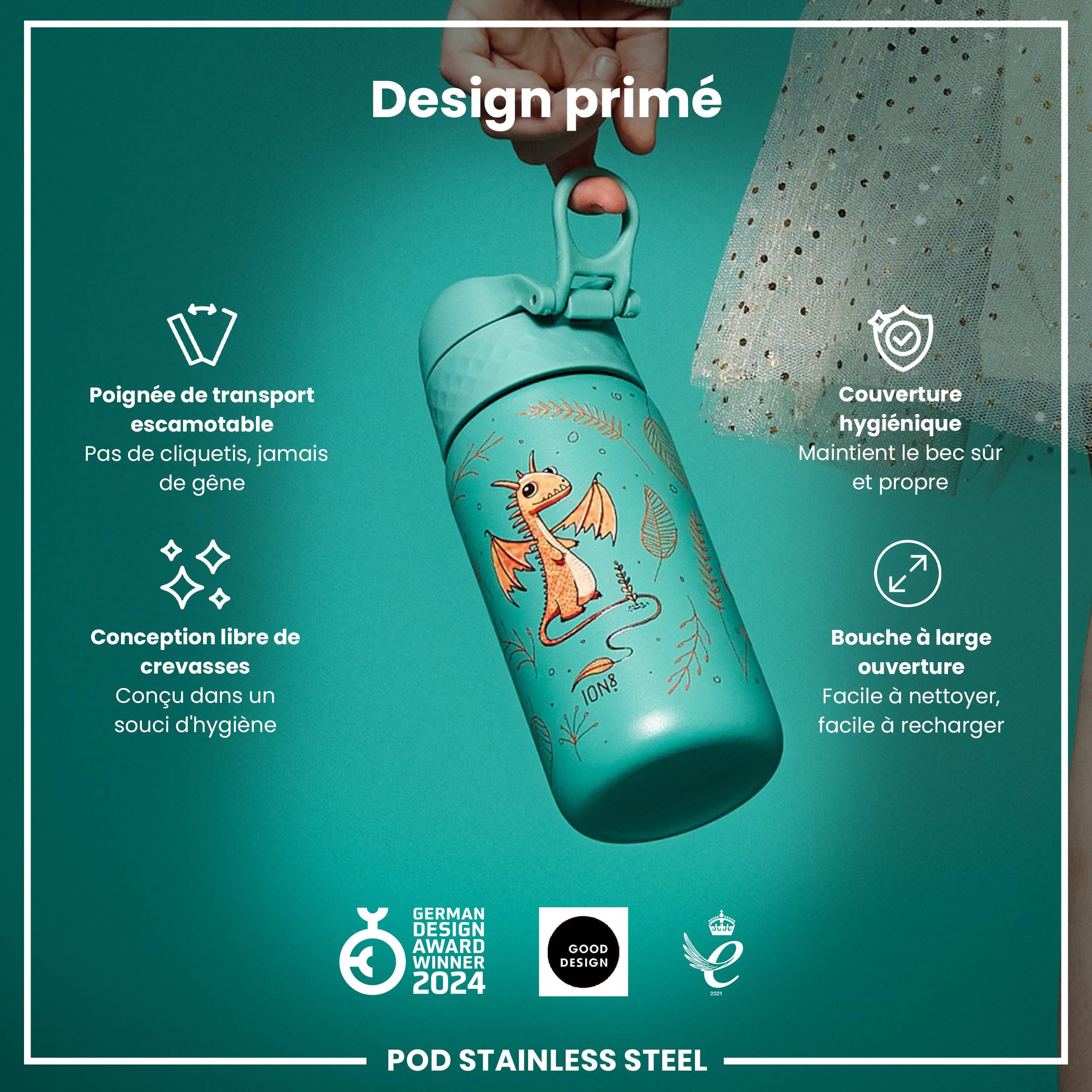 Étanches, colorées et lavables au lave-vaisselle—faciles à utiliser au quotidien. Cette bouteille en acier inoxydable est conçue pour être 100% étanche, garantissant l'absence de fuites ou de désordres lors des aventures de votre enfant. Avec une capacité de 400ml, elle est de la bonne taille pour que les enfants la portent partout. GOURDES RÉCOMPENSÉES – Lauréates de 3 prix de design, les gourdes ION8 sont idéales pour l’hydratation nomade. La gourde ION8 offre une couverture de bec hygiénique unique qui peut être complètement ouverte d'un seul doigt et se verrouille en toute sécurité pour plus de sécurité lorsqu'elle est jetée dans un sac. Marque. Ion8 · Capacité. 400 Millilitres · Couleur. Girafes Volantes · Usages recommandés pour le produit. En buvant, Navette, Sports, Voyage, École CONCEPTION ÉTANCHE – Triple verrouillage, couvercle à pression et sécurité intégrée empêchent les fuites. Cependant, elle n'est pas adaptée aux boissons très chaudes, garantissant la sécurité de votre enfant à tout moment. Découvrez la Gourde Enfant Étanche ION8, le compagnon d'hydratation parfait pour vos petits. Bouteille Inox Anti-fuite ION8 Gourde Isotherme Enfant, Inox, 320ml, Anti-Fuite, Facile à Ouvrir Gourde Paille Adulte Ion8 Gourde Enfant Inox 400ml, Anti-Fuite, Facile à Ouvrir... RECHARGE FACILE – Le couvercle s’ouvre complètement, pour boire facilement. Compatibles avec une petite paille pour encore plus de confort. ACIER INOXYDABLE LAVABLE – Fabriquées en acier inoxydable alimentaire, résistant aux odeurs et au lave-vaisselle. Fini les sacs mouillés—restez tranquille et au sec. Gourde Anti Fuite Ion8 Gourde Enfant, 350ml, Anti-Fuite, Facile à Remarque : ne gardent pas la température des boissons. Le matériau en acier inoxydable est alimentaire, résistant aux odeurs et maintient le contenu frais et savoureux. Elle est lavable en lave-vaisselle dans le panier supérieur et est équipée de protections de sécurité autour des joints, ce qui la rend plus facile à nettoyer que jamais. Elle convient aux boissons chaudes et froides, avec une plage de température de -10°C à 70°C, en faisant un accessoire pour toutes les saisons.