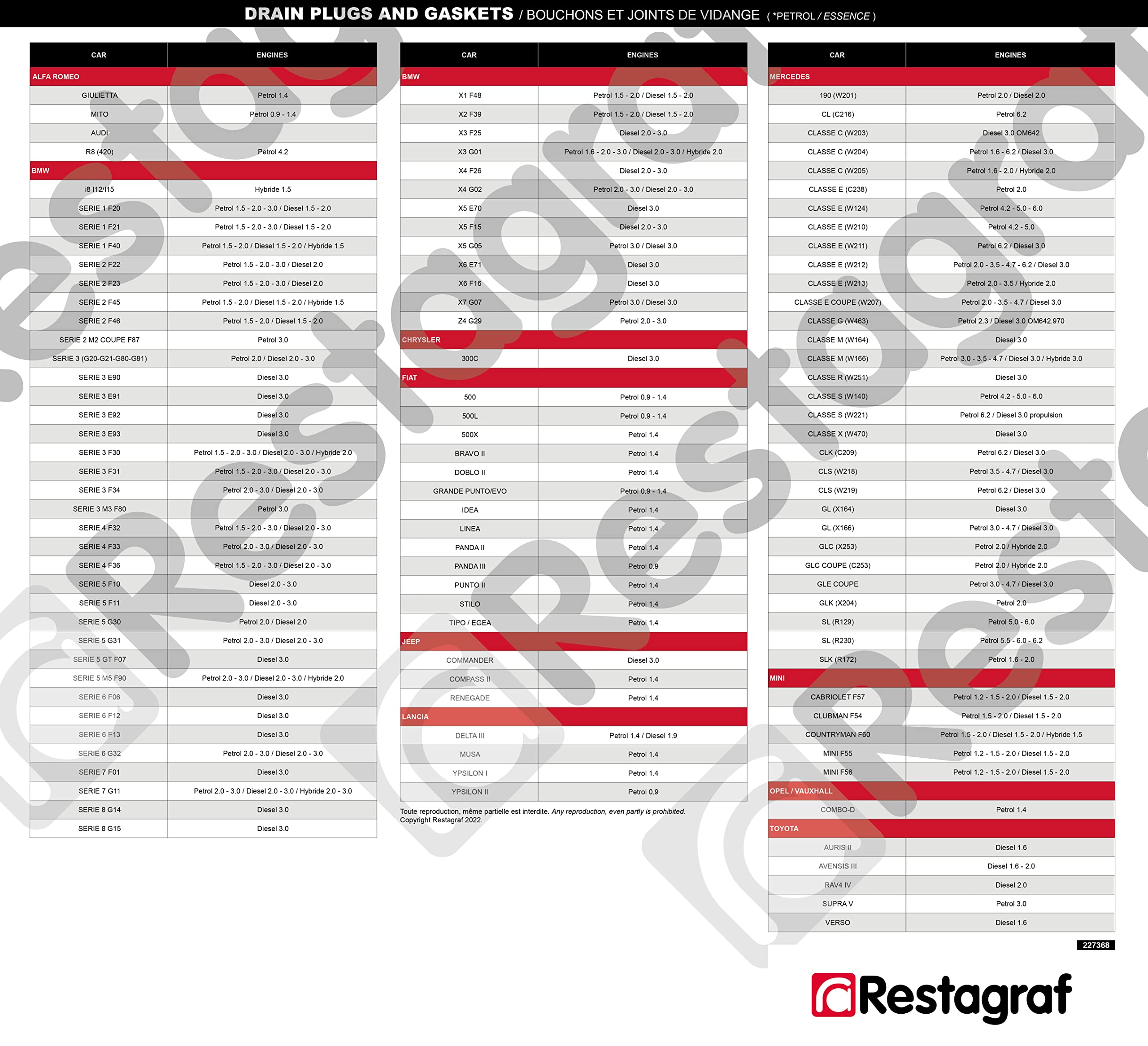 Boite Joint De Vidange JOINT DE VIDANGE CUIVRE PLAT DIAM INT DE 8 à 14 Mm - DIAM EXT DE 12 à Joint Cuivre Bouchon Vidange 3 Joints De Vidange RESTAGRAF N°728 En Cuivre Diamètre Intérieur 24 Mm Diametre Exterieur 32 Mm Epaisseur 2 5 Mm 2435193 3 joints de vidange RESTAGRAF n°719 en cuivre diamètre intérieur 22 mm... À changer systématiquement à chaque vidange pour garantir l’étanchéité du système de lubrification. Protège le filetage du carter et du bouchon en assurant une surface d’appui souple et efficace, évitant le serrage excessif et l’usure prématurée. ÉTANCHÉITÉ PARFAITE : Garantissent l’absence de fuite d’huile au niveau du bouchon de vidange après une vidange moteur. Compatible avec Alfa Romeo, BMW, Fiat, Jeep, Lancia, Mercedes, Mini, Opel/Vauxhall, Toyota (certains moteurs). REMPLACEMENT ESSENTIEL : À changer systématiquement à chaque vidange pour garantir l’étanchéité du système de lubrification. FACILES À POSER : Se montent rapidement sans outillage spécifique, directement entre le bouchon de vidange et le carter. PRÉVIENT LES DÉGRADATIONS : Protège le filetage du carter et du bouchon en assurant une surface d’appui souple et efficace, évitant le serrage excessif et l’usure prématurée. Kit d'accessoires de voiture professionnels, ronde... – Grandado