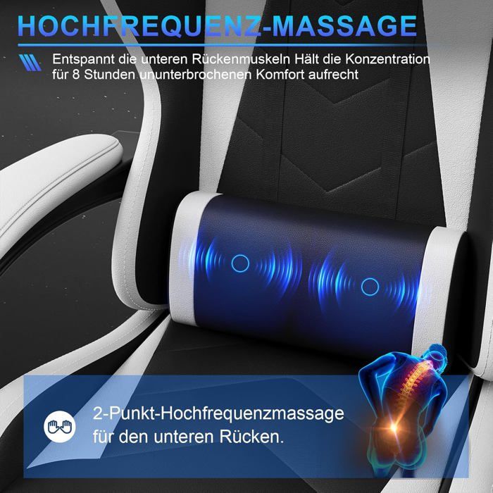 【Détente et récupération】 : Le dossier du fauteuil gaming peut être réglé à des angles d'inclinaison de 90, 120 et 150 degrés. 【ERGONOMIQUE ET CONFORT】 : Nos sièges informatiques ont été soigneusement conçus selon des critères ergonomiques afin d'offrir un soutien optimal à la nuque, aux épaules, au dos et aux lombaires. Le design ergonomique favorise un alignement correct et réduit la tension sur les muscles de votre cou pour une assise confortable. Le coussin d'assise confortable a une épaisseur de 10 cm et garantit un confort d'assise particulièrement agréable. Fauteuil de massage ergonomique JUMMICO avec soutien lombaire - Chaise d'ordinateur - Chaise de Bureau - Charge maximale 150 kg - - Maison Les roulettes ultra-silencieuses vous permettent de jouer et de vous détendre sans être dérangé. Le JETSREAM peut supporter jusqu'à 150 kg et résiste ainsi même aux sessions turbulentes devant l'ordinateur. Conception ergonomique avec support lombaire de massage : cette chaise de jeu est dotée d'un massage lombaire réglable pour réduire la fatigue du dos pendant... Votre satisfaction est notre priorité. Grâce à ses nombreuses fonctionnalités de confort, vous pouvez travailler ou jouer pendant de longues heures dans le plus grand confort. Les coussins réglables pour la tête et les lombaires sont conçus pour soulager les douleurs cervicales et dorsales ainsi que les tensions. Support 150kg Design Blanc Chaise Gaming JUMMICO Avec Massage, Ergonomique, Dossier Réglable Et Repose-Pieds, Blanc - Informatique Gaming Chair Les coussins réglables pour la tête et les lombaires sont conçus pour soulager les douleurs cervicales et dorsales ainsi que les tensions. Le design ergonomique favorise un alignement correct et réduit la tension sur les muscles de votre cou pour une assise confortable Si vous rencontrez des problèmes, veuillez nous rapidement via Amazon, et nous serons ravis de vous aider.