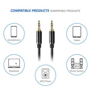 Câble Audio Auxiliaire Double Jack Mâle / Mâle 3.5mm Longueur 1m - Blanc à Prix Câble audio jack stéréo 3,5 mm mâle-2 RCA mâle - L1,2 m MC KENZIE... Cable Jack 3.5 Male Male Câble Audio Jack 3.5mm 1m Mâle Vers Mâle Câbles Stéréo Jack Jack 3.5mm 4 Pôles Pour Casque PS4 Sony Voiture Smartphones Lecteur MP3 Echo Dot Chaines HI-FI Philips DVD Portable 1m Câble Pour Casque Voiture Ce câble permet une transmission audio de haute qualité, idéal pour écouter de la musique, passer des appels ou connecter des appareils à des systèmes audio. Son design fin et recouvert de blanc lui confère un look épuré et moderne, tout en étant léger et facile à transporter. 14,99 € ... Alipis 2 adaptateurs répartiteurs Audio/vidéo TRS 3,5 mm vers Double Prise Jack, connecteurs stéréo mâle vers Double Femelle Rouge/Blanche... Fabriqué avec des matériaux résistants, il dispose de connecteurs métalliques qui garantissent une connexion stable et durable, réduisant la perte de signal et offrant un son clair et net. Contenu du paquet : 1x câble jack 3,5 mm Longueur du câble : 1 m Idéal pour les connexions audio : connectez facilement des appareils de lecture dotés d'une entrée/sortie auxiliaire, tels que des smartphones et des tablettes, à des systèmes audio ou à des écouteurs dotés d'une prise jack 3,5 mm.